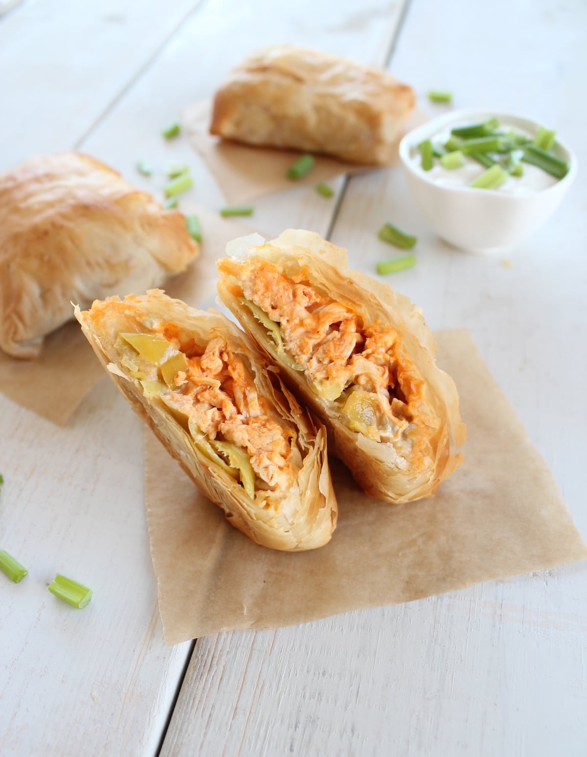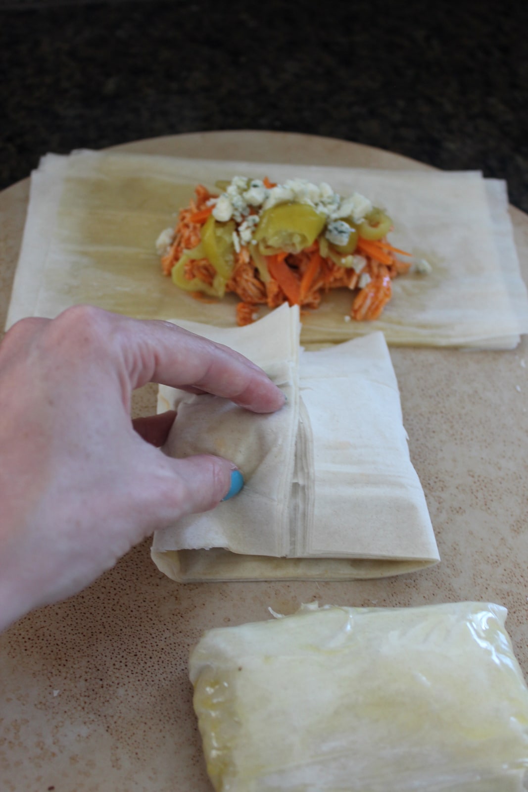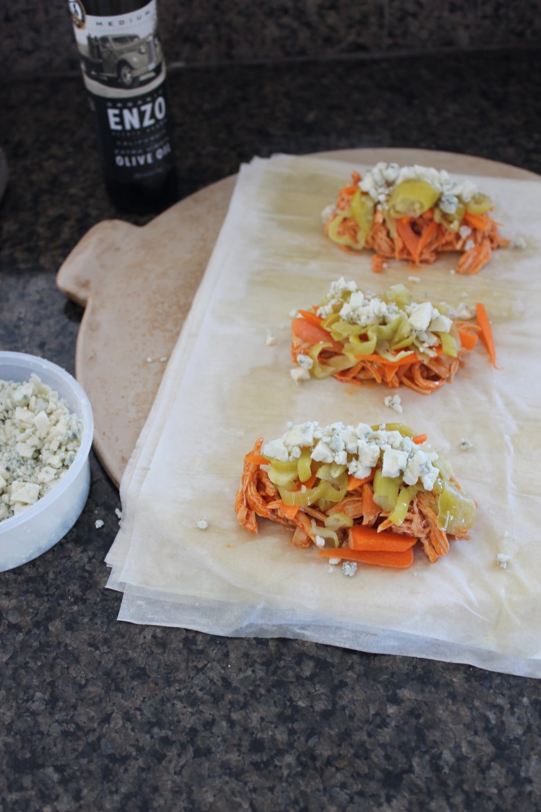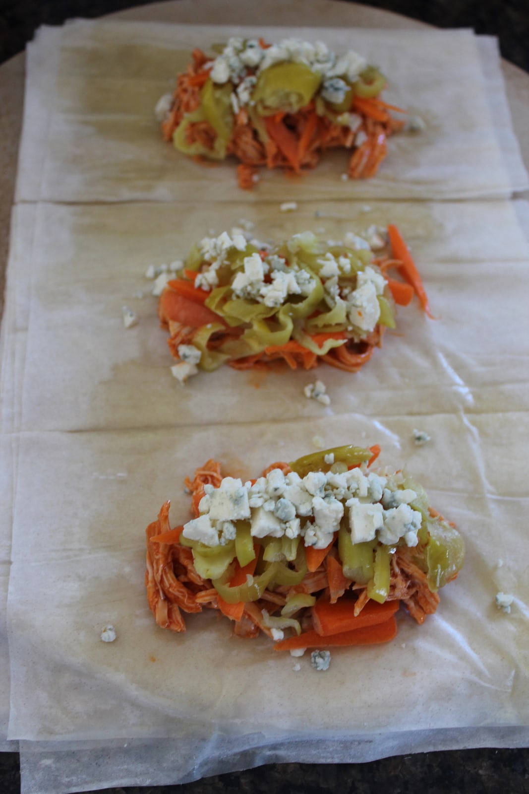 I had a roll of phyllo dough in the fridge, so I decided to wrap the buffalo chicken in the flakey, delicious exterior, then pack the inside with some my favorite buffalo sauce accouterments like blue cheese and carrots!