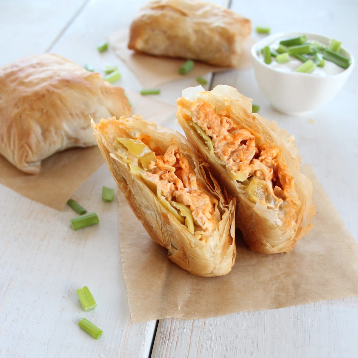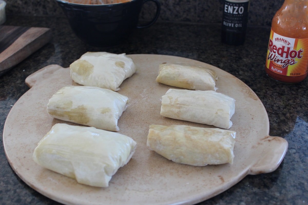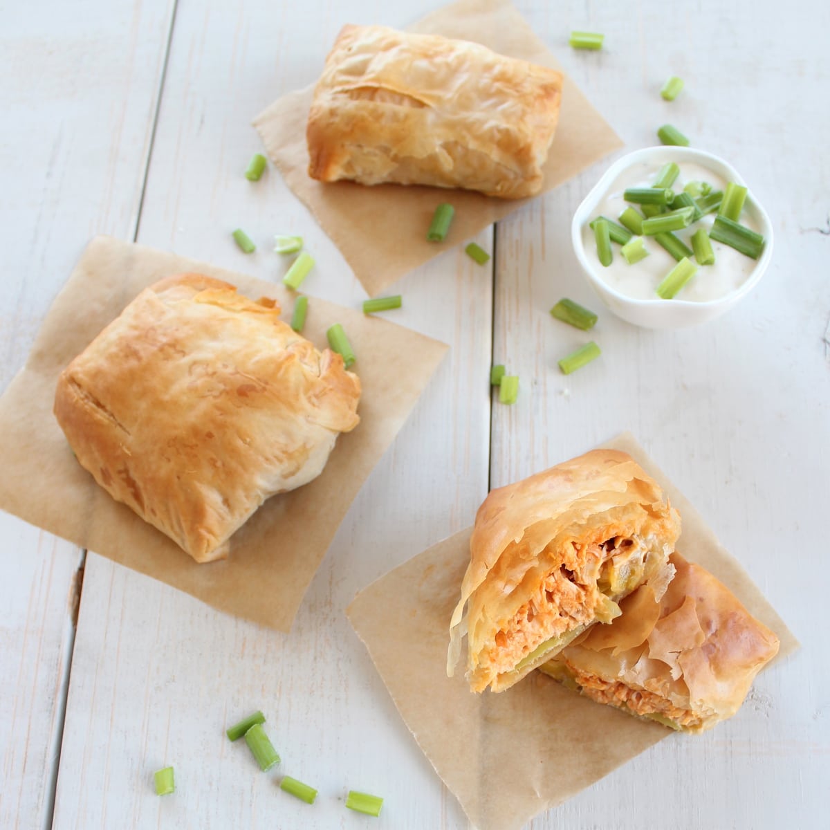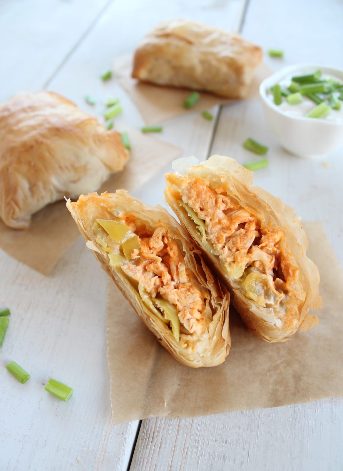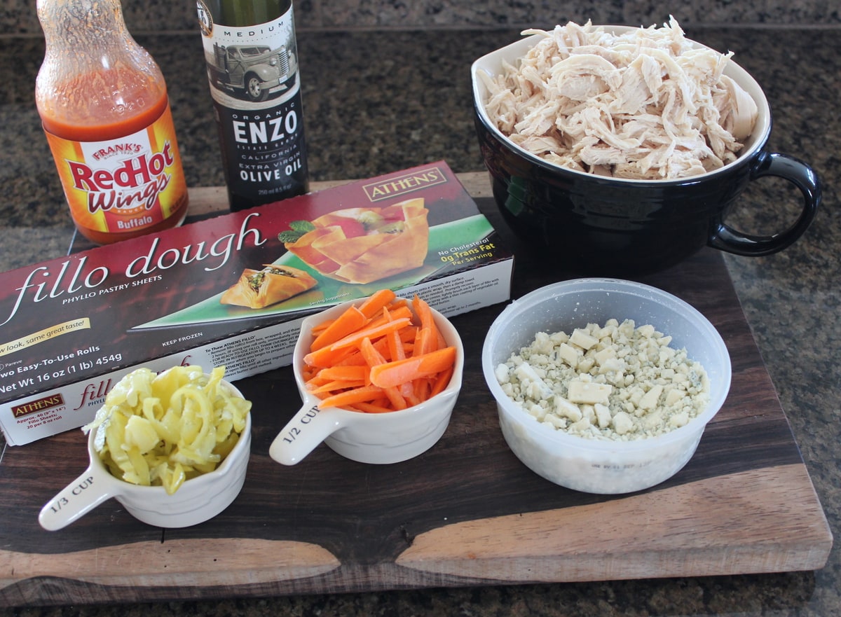 I had a roll of phyllo dough in the fridge, so I decided to wrap the buffalo chicken in the flakey, delicious exterior, then pack the inside with some my favorite buffalo sauce accouterments like blue cheese and carrots!