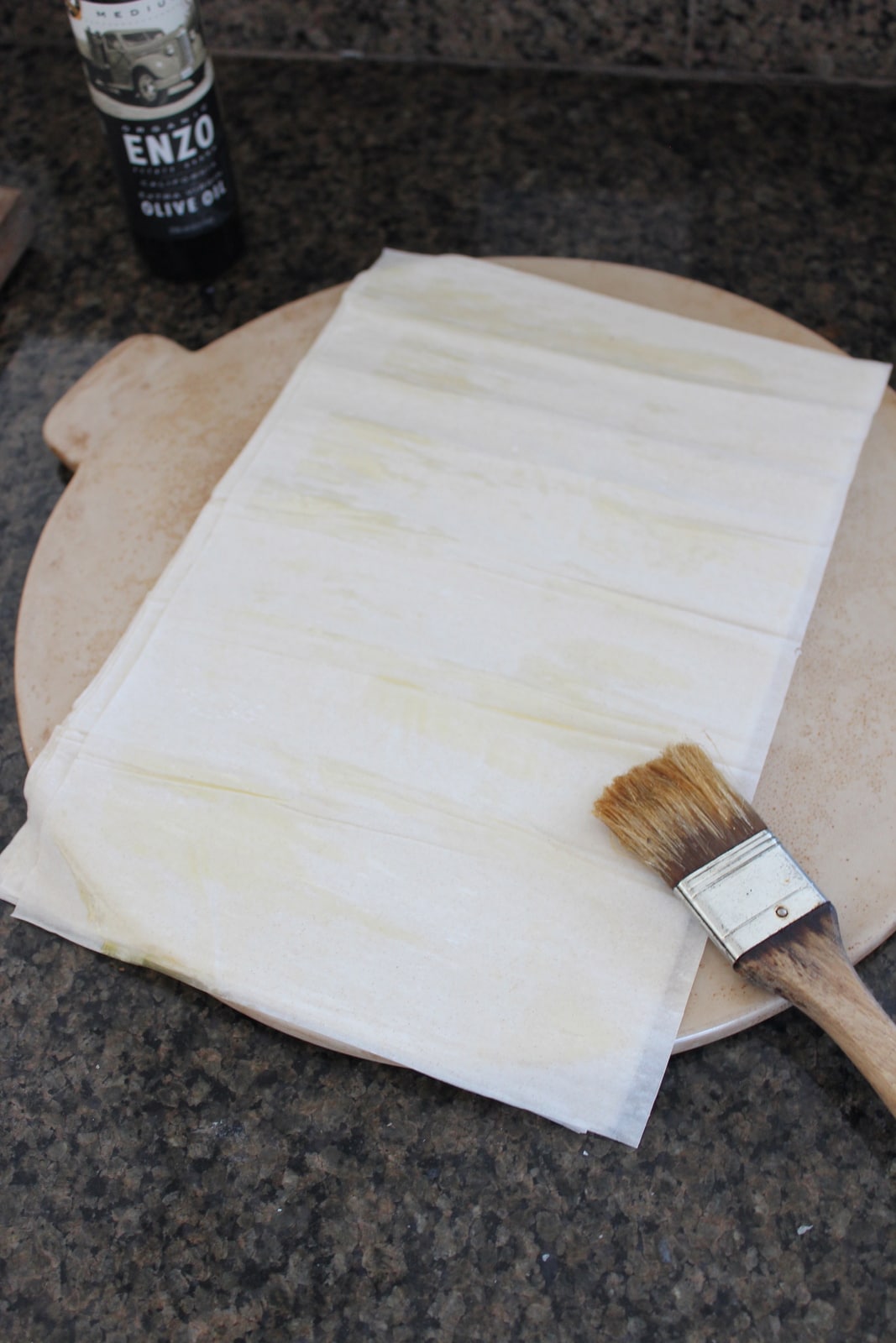 - Brush each sheet of phyllo dough lightly with olive oil.
