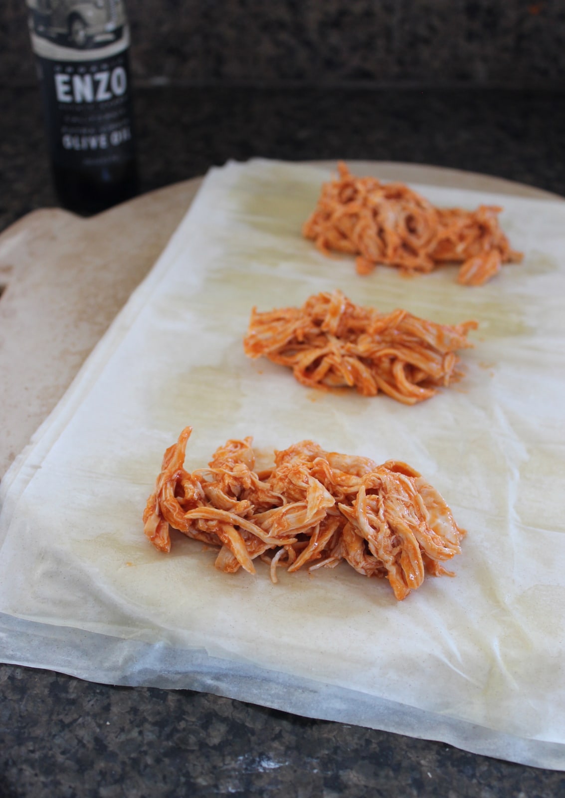 Combine the buffalo sauce with the shredded chicken, then place the chicken evenly apart in three small sections in the middle of both stacks of phyllo dough.