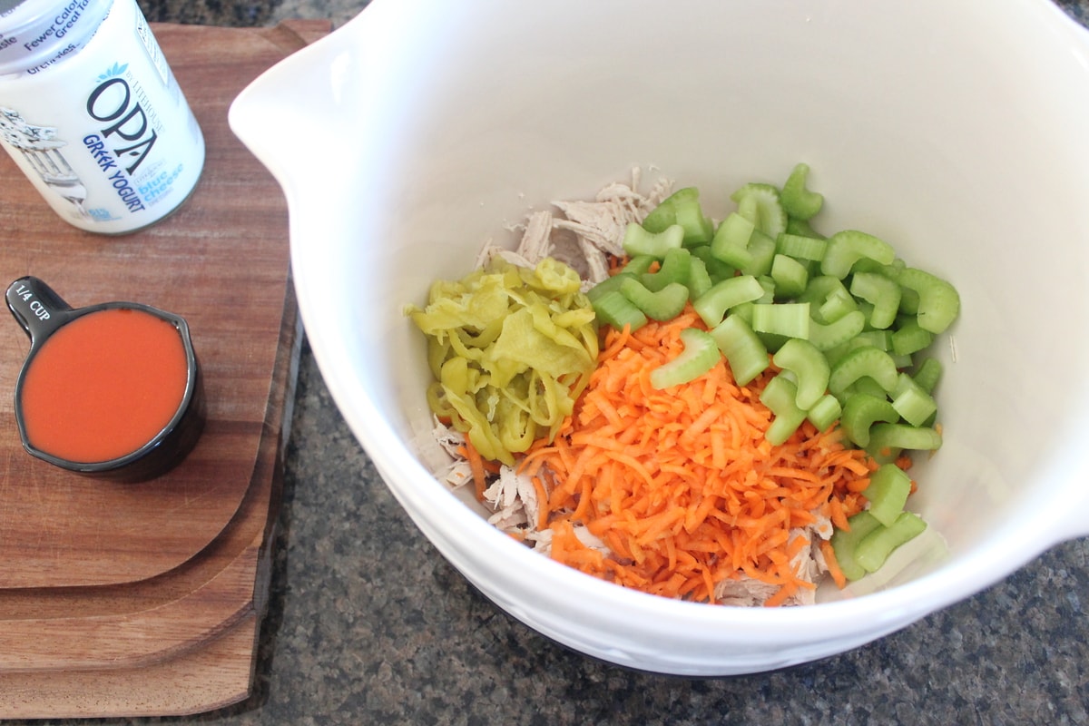 - Combine the shredded chicken, pepperoncinis, carrots, celery and cilantro in a large bowl.