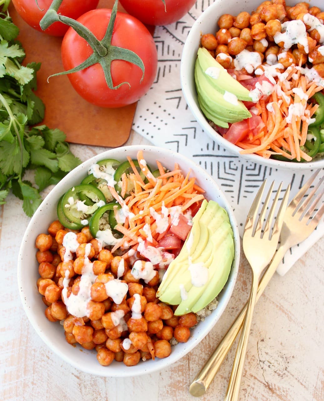 - Divide the quinoa between two bowls, top with the buffalo chickpeas, carrots, tomatoes, jalapenos and avocado.