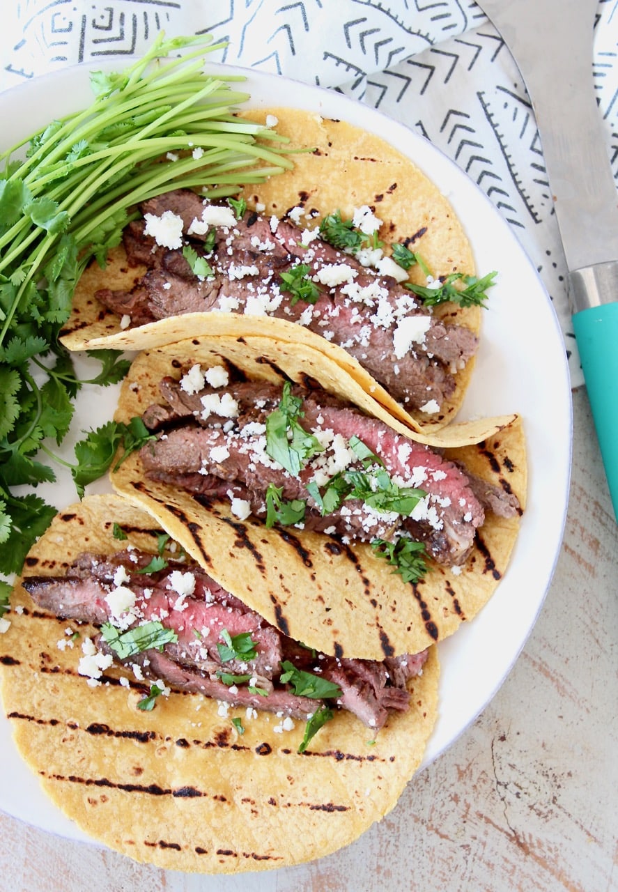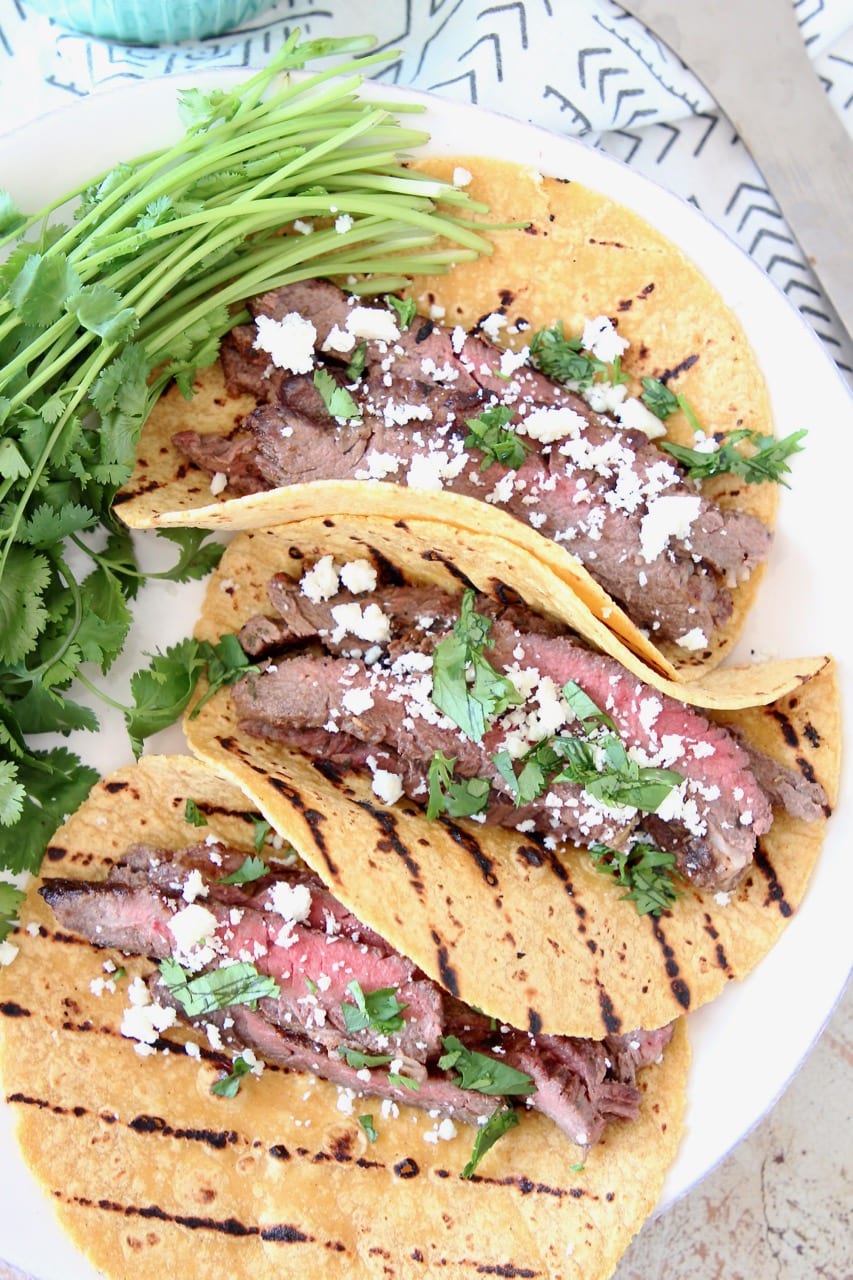 Skirt steak is commonly used for tacos. It’s an affordable cut of steak, that when properly marinated, grilled and sliced thinly against the grain is tender and flavorful. It also cooks quickly because it’s such a thin cut, which makes it perfect for quick and easy weeknight meals.