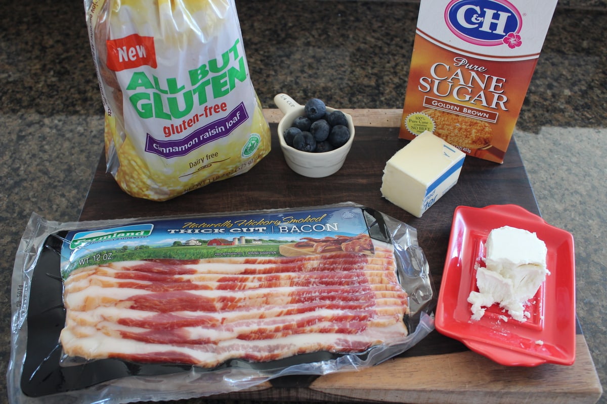 Place 2 strips of bacon on one side of the bread and a few blueberries on the other side.