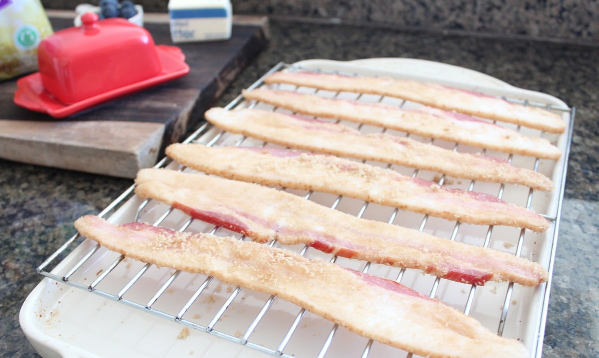 - Lay the bacon strips across a wire rack on top of a baking sheet.