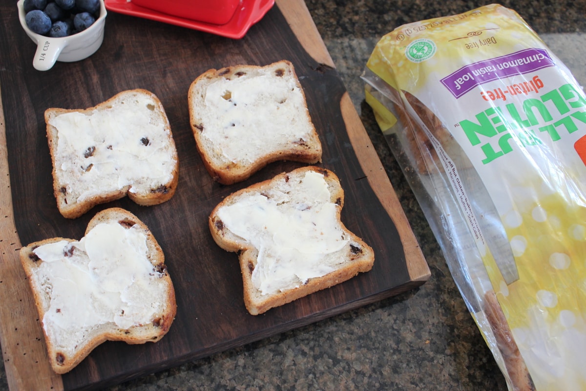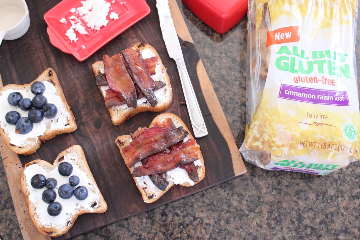 I took gluten free sweet and scrumptious Cinnamon Raisin Bread and sandwiched in brown sugar candied bacon, fresh blueberries and goat cheese for the ultimate in decadent grilled cheese sandwiches!