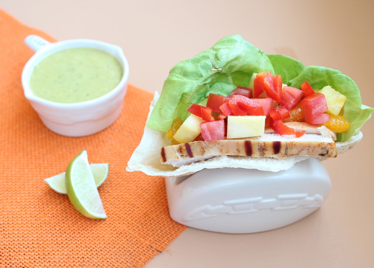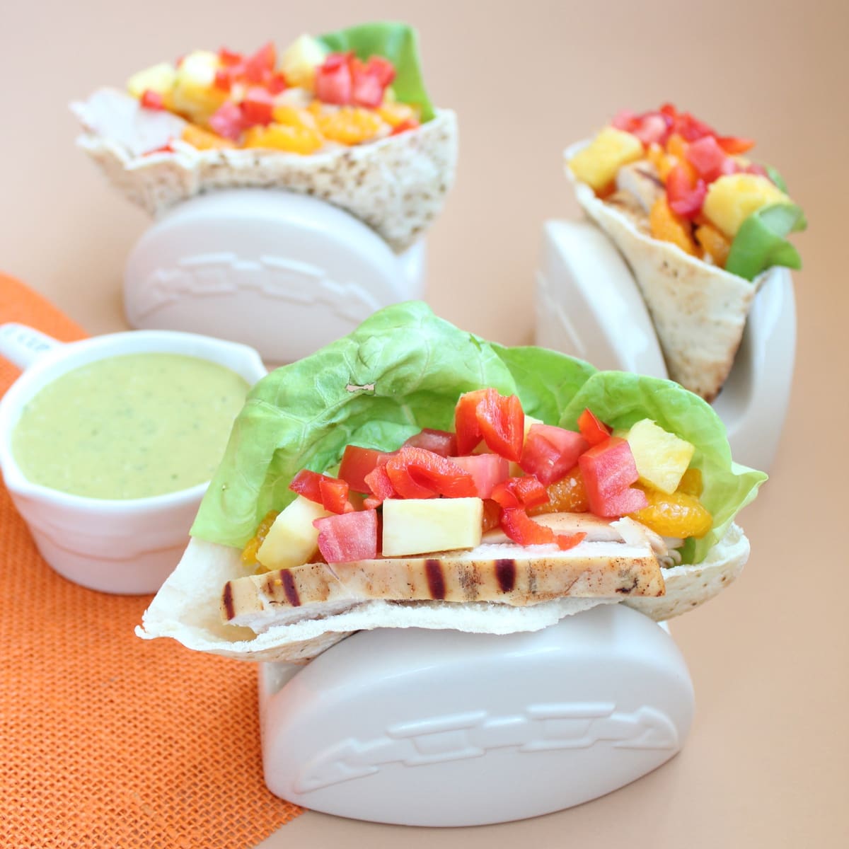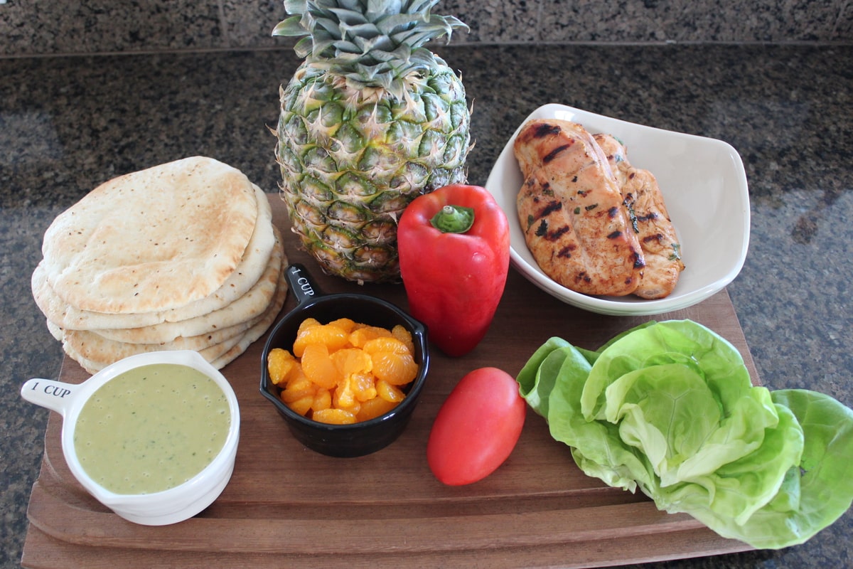 - Slice each pita bread in half, then place a leaf of butter lettuce in each half of pita bread, followed by the chicken, then top with the mandarin oranges, pineapple, bell pepper and tomatoes.