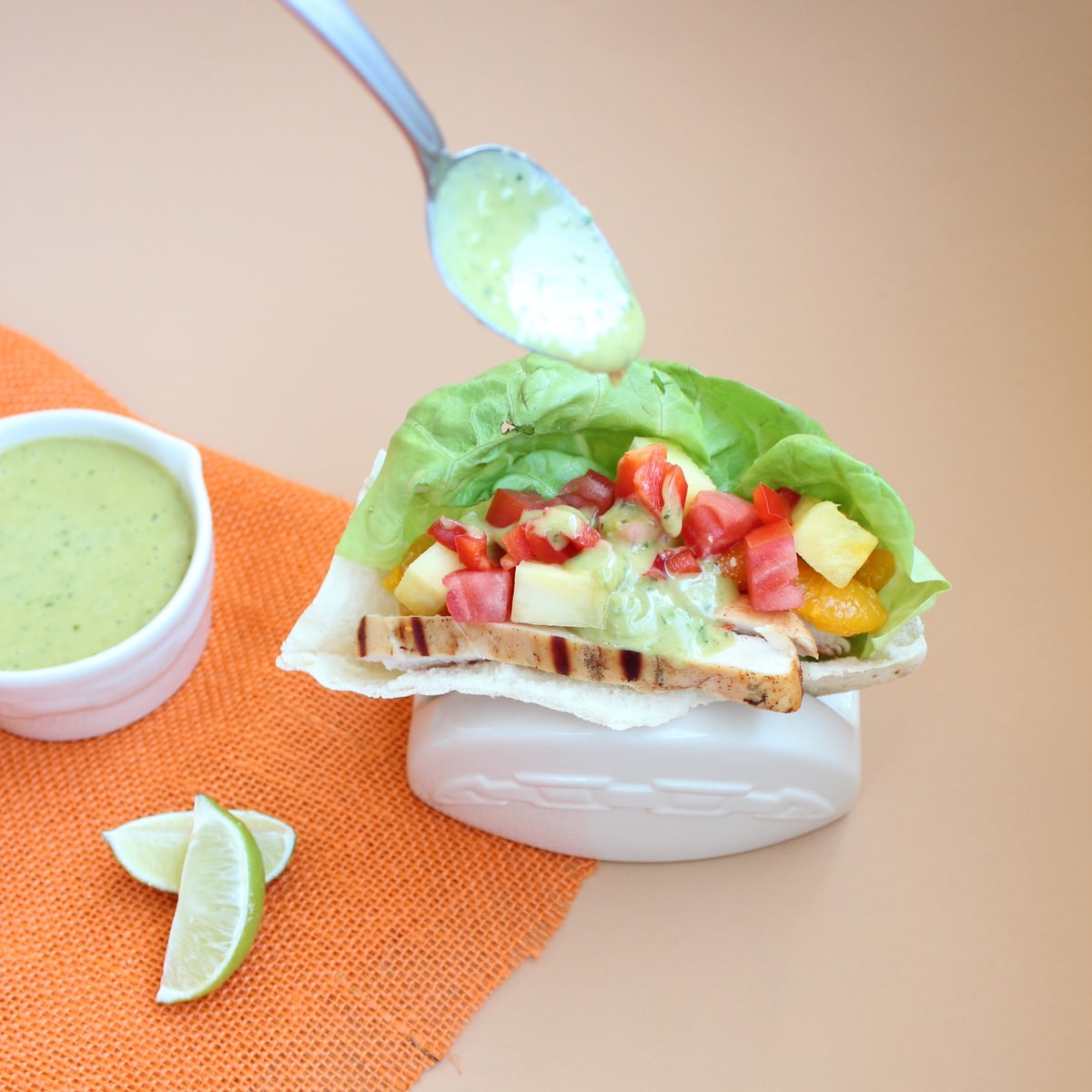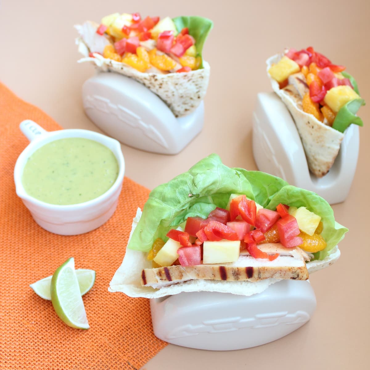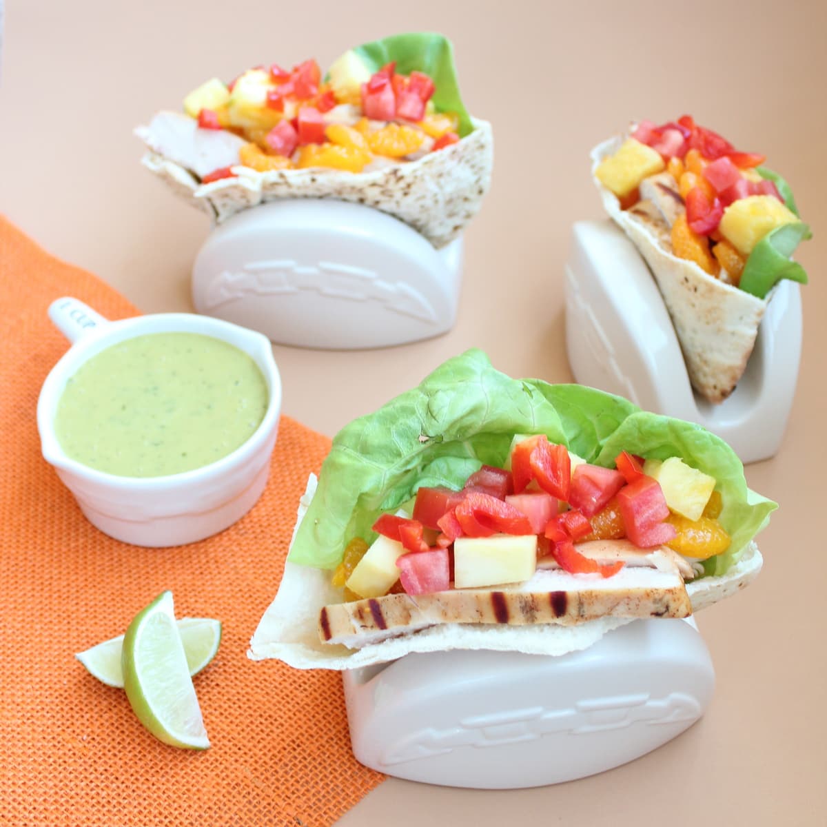 - Slice each pita bread in half, then place a leaf of butter lettuce in each half of pita bread, followed by the chicken, then top with the mandarin oranges, pineapple, bell pepper and tomatoes.