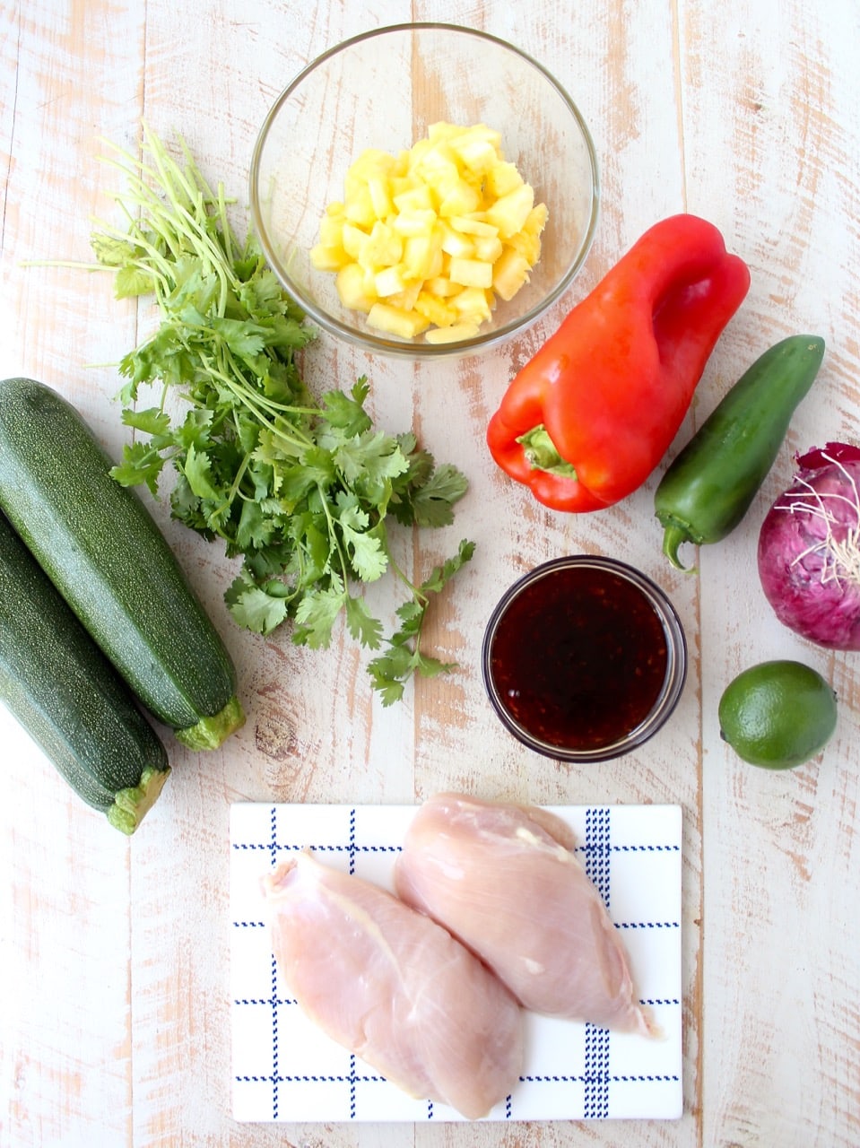 Divide the zucchini noodles between two bowls. Once the chicken is grilled, slice it up and place on top of the zoodles. Spoon the pineapple salsa over the chicken and zoodles. Drizzle the remaining teriyaki sauce over the bowl.