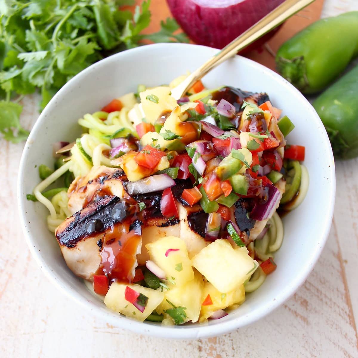 Grilled chicken teriyaki is served over zucchini noodles and topped with pineapple salsa in these healthy, gluten free and delicious zoodle bowls!