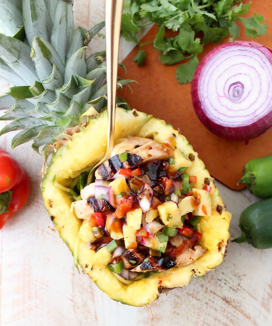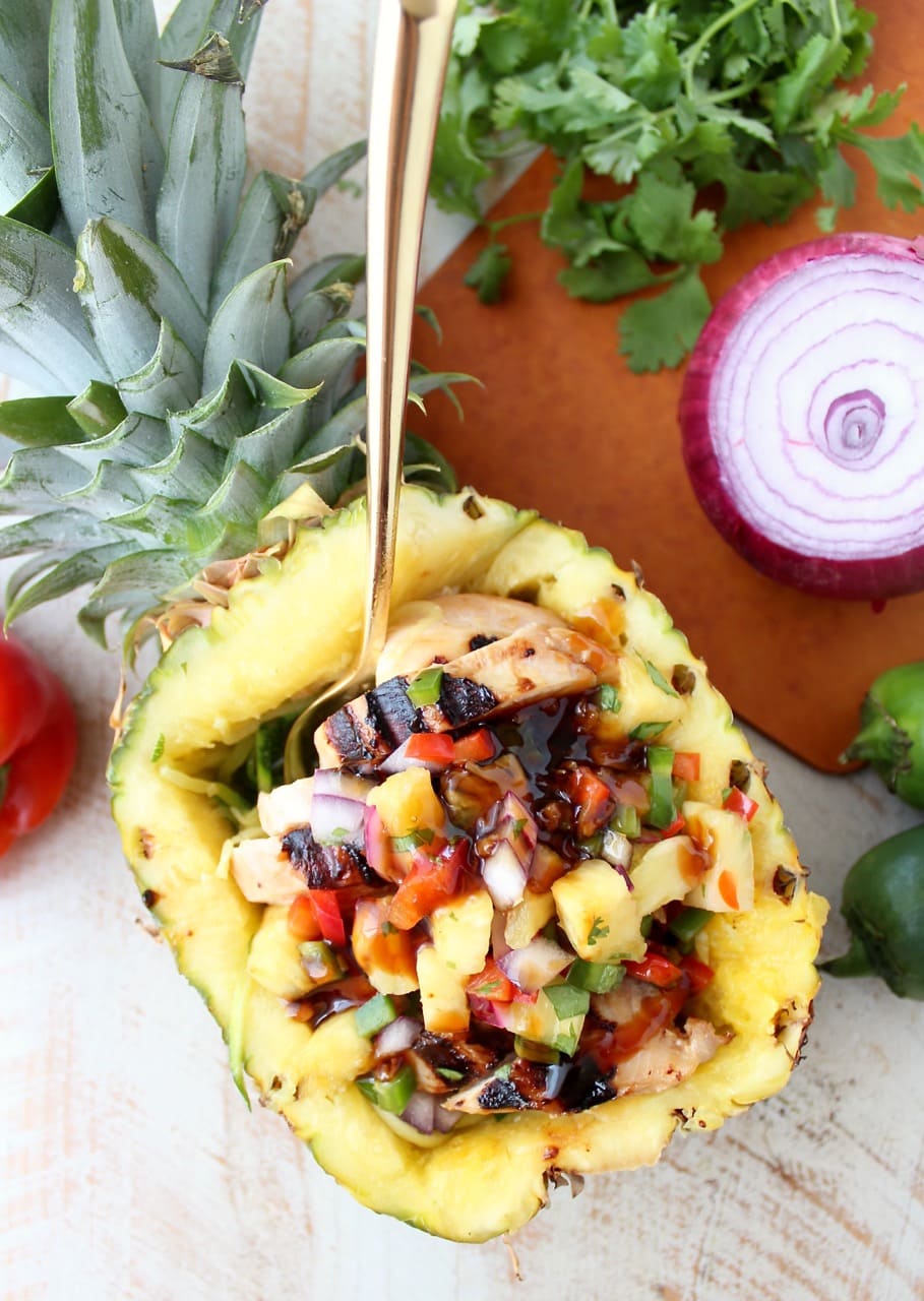 Since I used fresh pineapple in the salsa and had an empty pineapple handy, I decided to get insta-fabulous and serve the teriyaki chicken zoodle bowls in a pineapple!