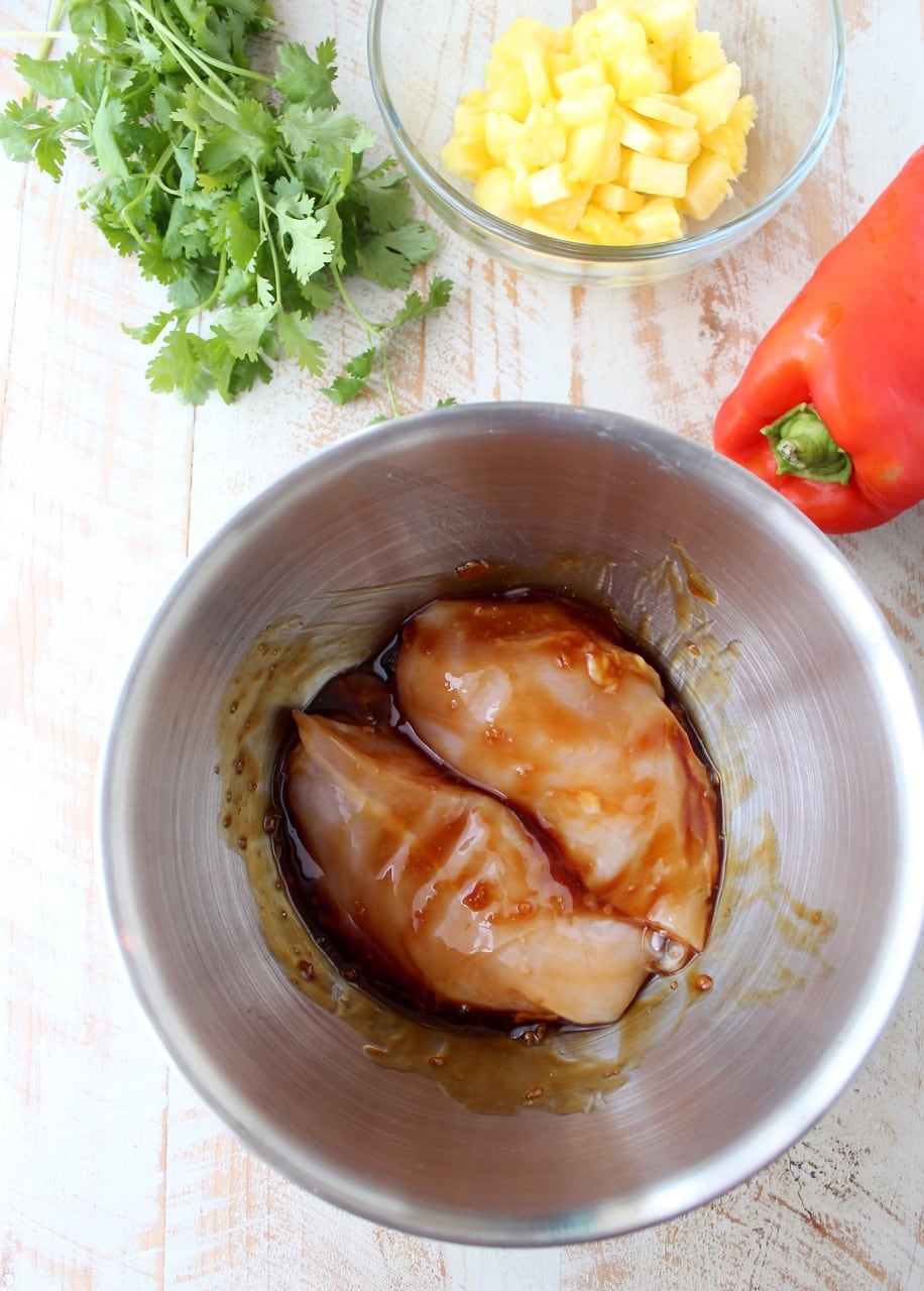 Place the chicken breasts in a bowl or ziplock bag and toss with ¼ cup of teriyaki sauce. Marinate for 30 minutes.