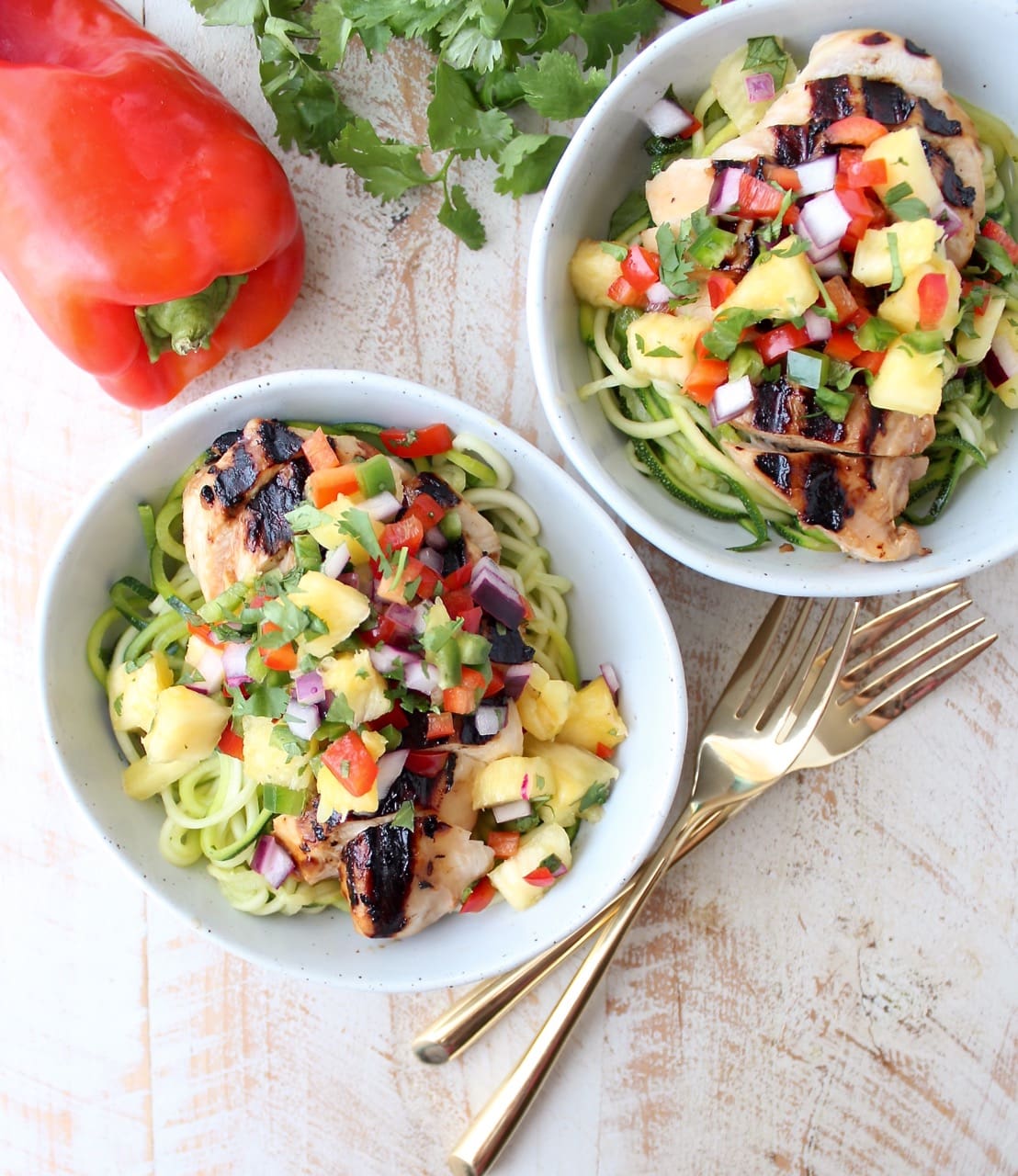 - Spoon the pineapple salsa over the chicken and zoodles.
