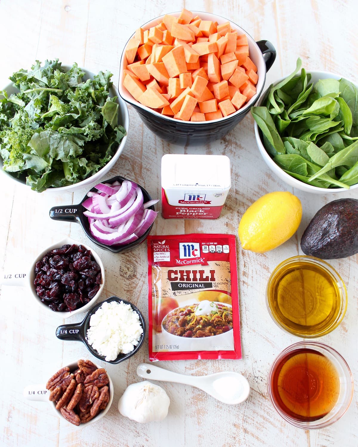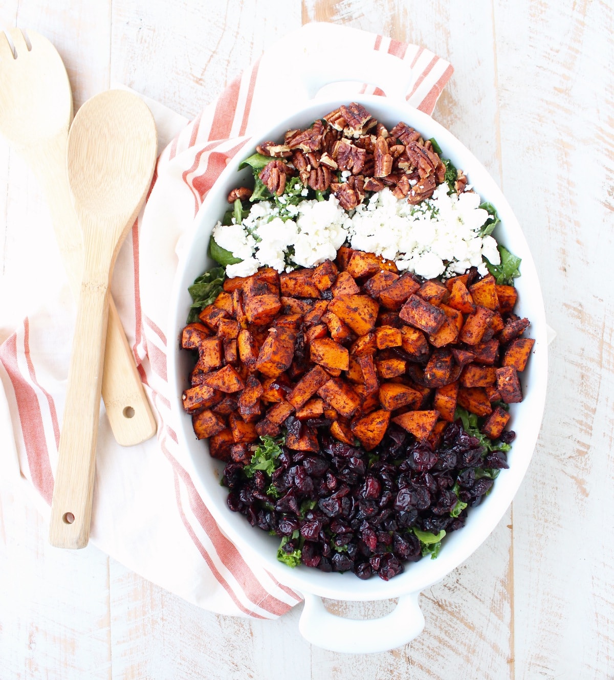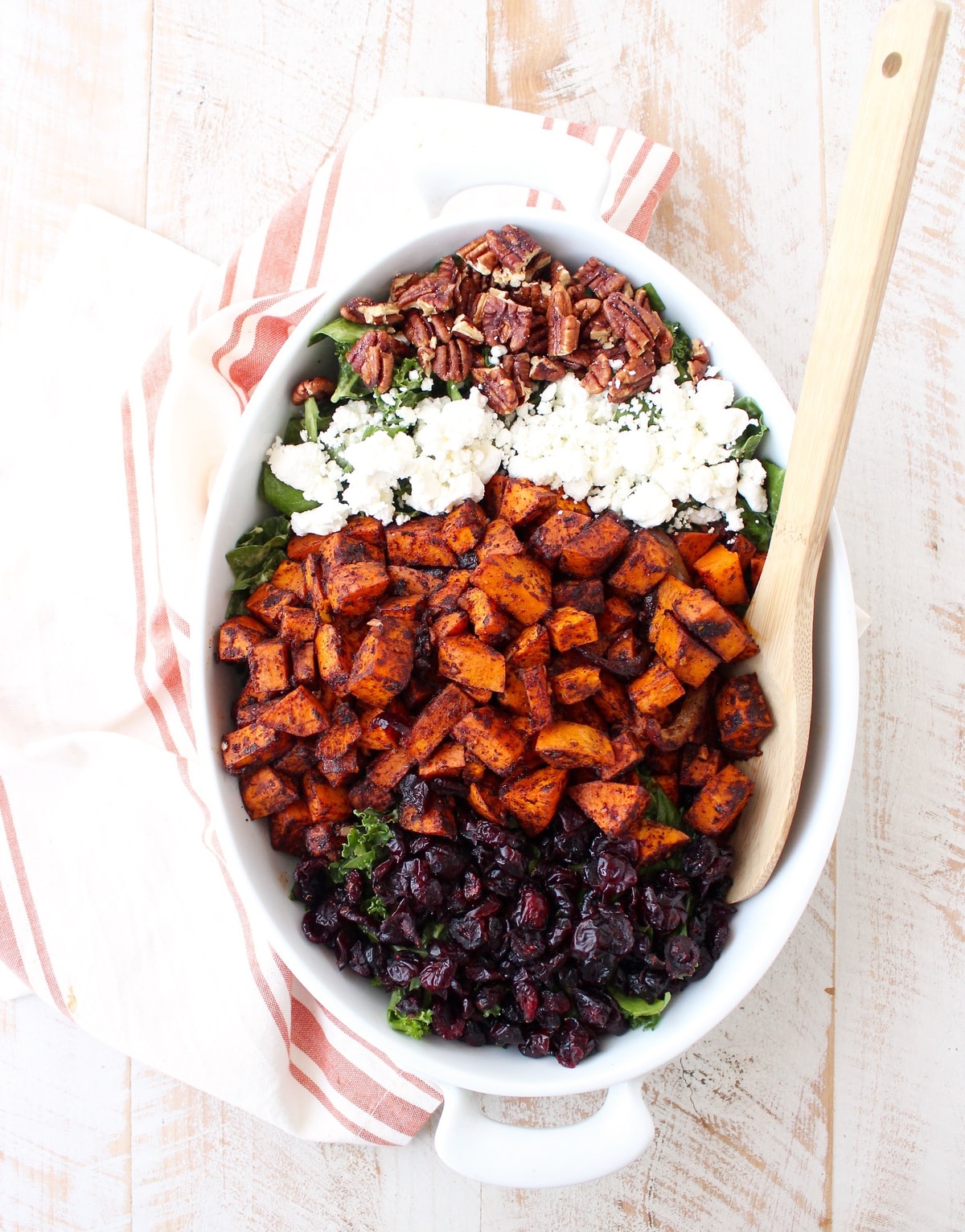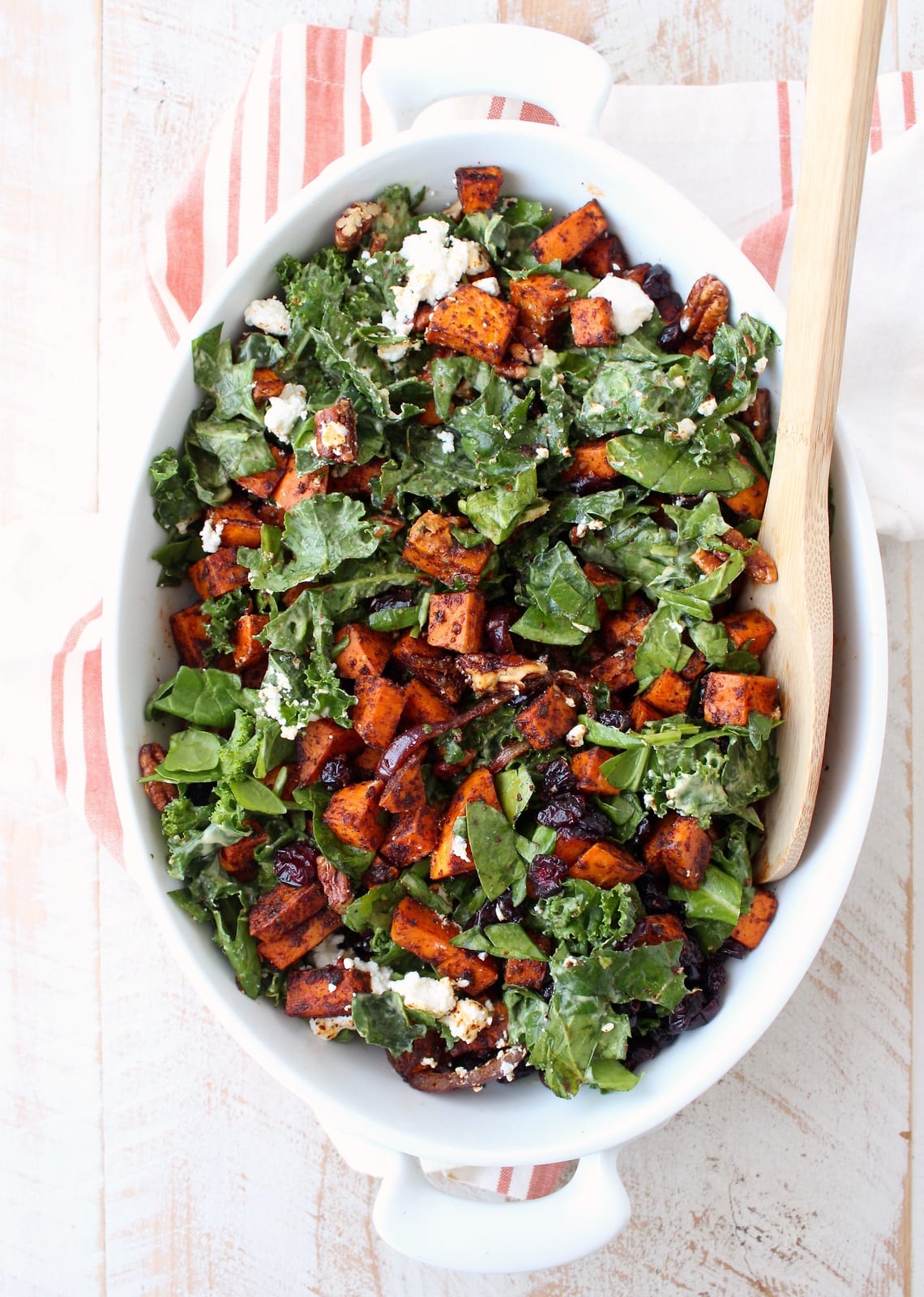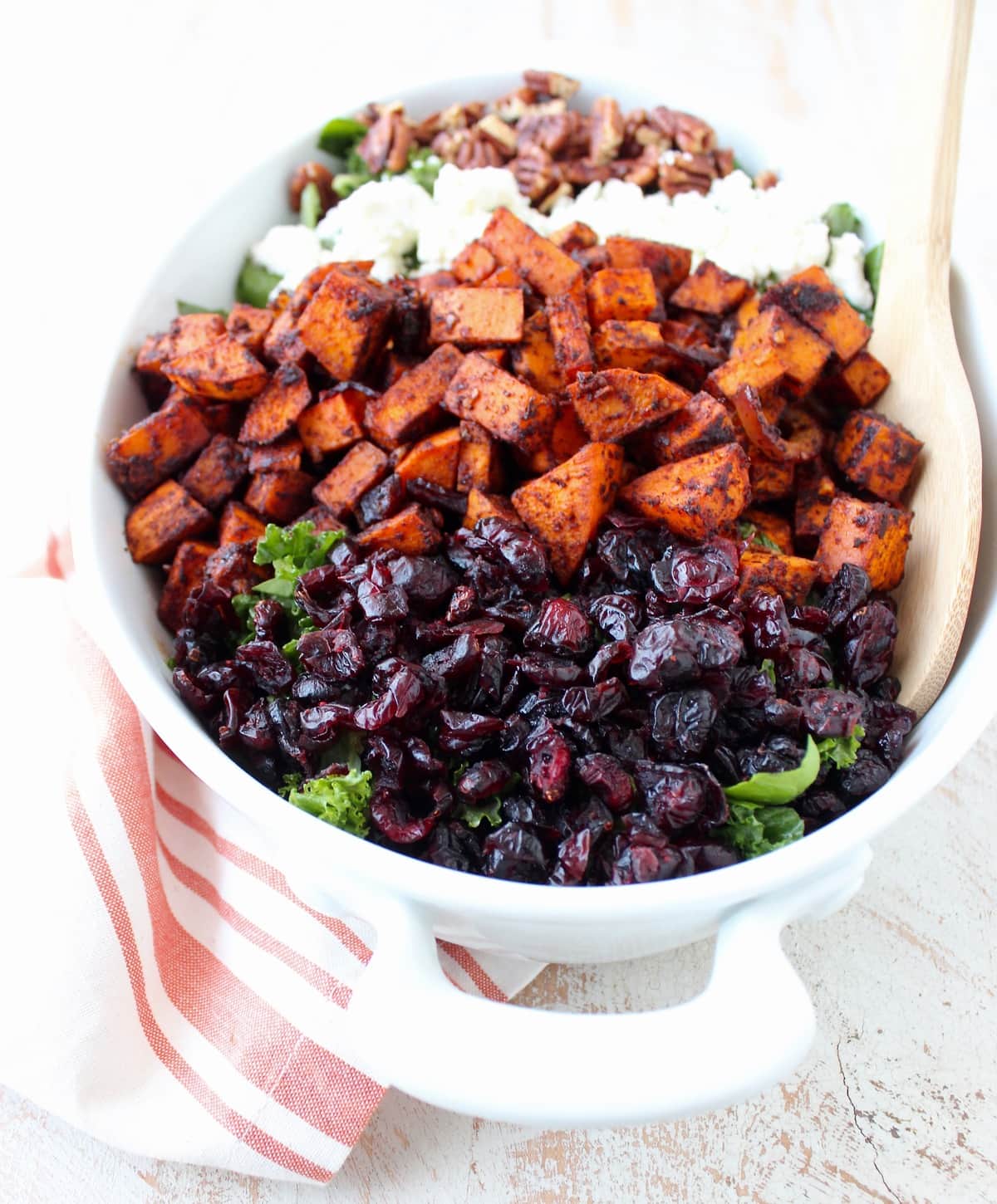 I remember this salad growing up that combined roasted sweet potatoes, dried cranberries and candied pecans, (I used to get in trouble for eating all of the candied pecans off the salad before dinner ). Somewhere along the way, I forgot about that salad and the recipe was lost.