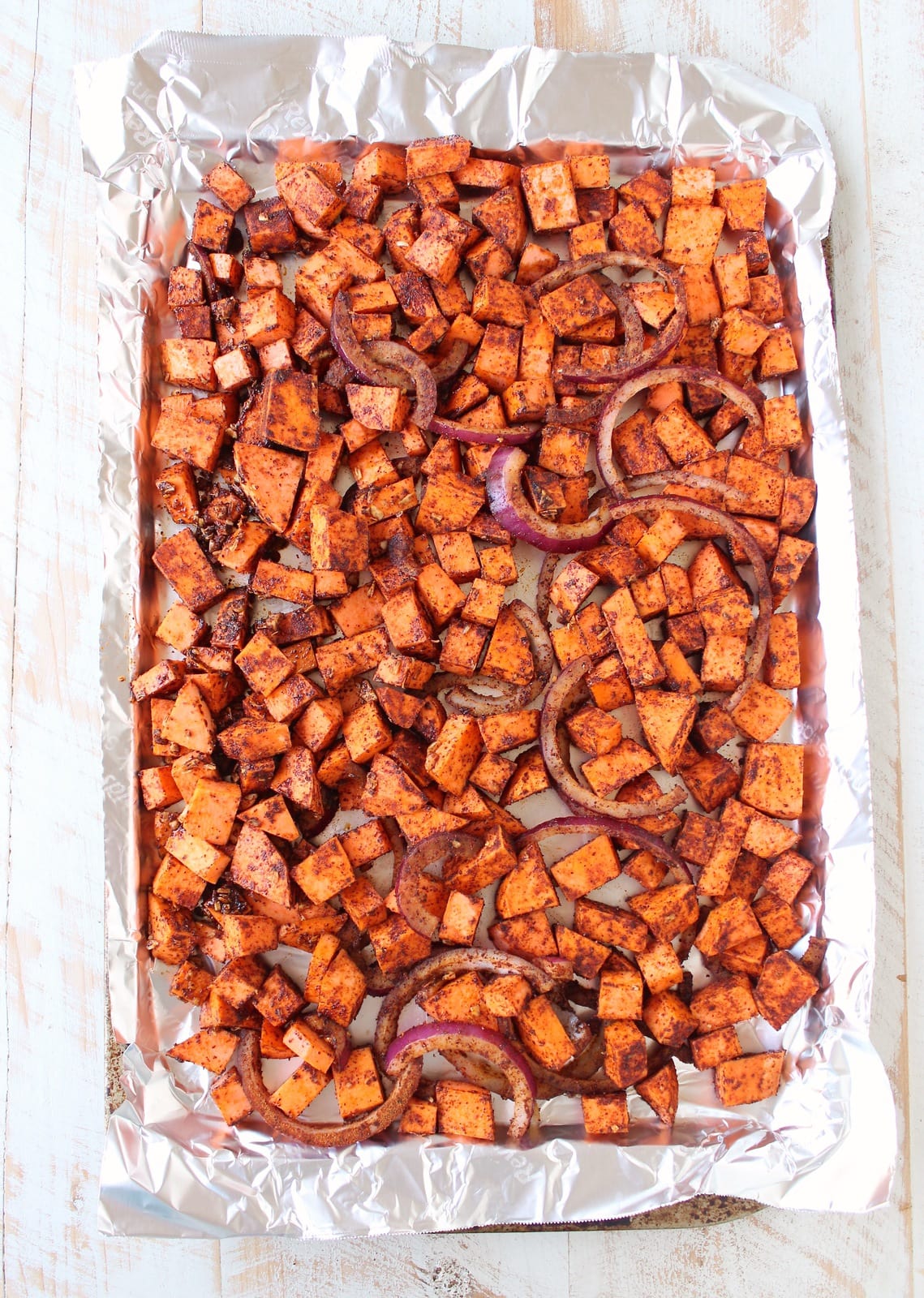 - Toss the sweet potatoes, red onion and garlic with the olive oil and chili seasoning mix.