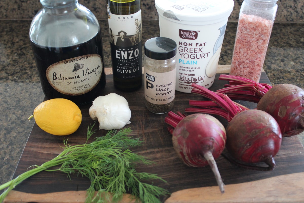 Place the beets in a food processor with the greek yogurt, vegetable stock, garlic, lemon juice, salt and pepper.