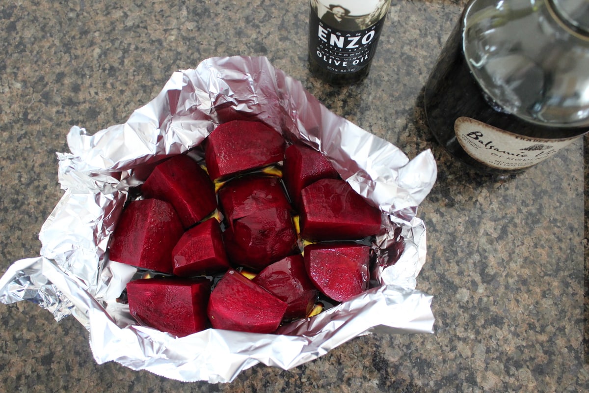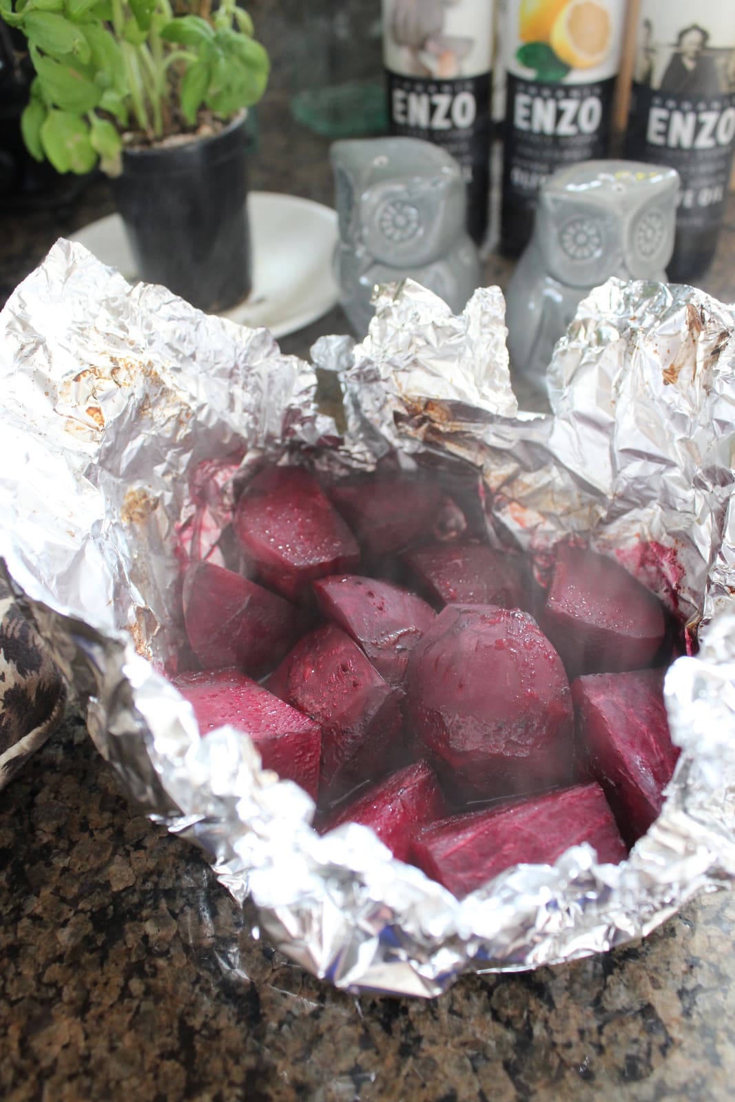 • Remove from the oven, open the foil and allow the beets to cool 10-15 minutes.