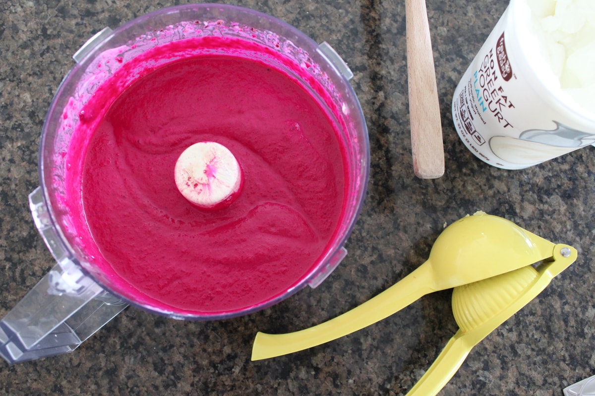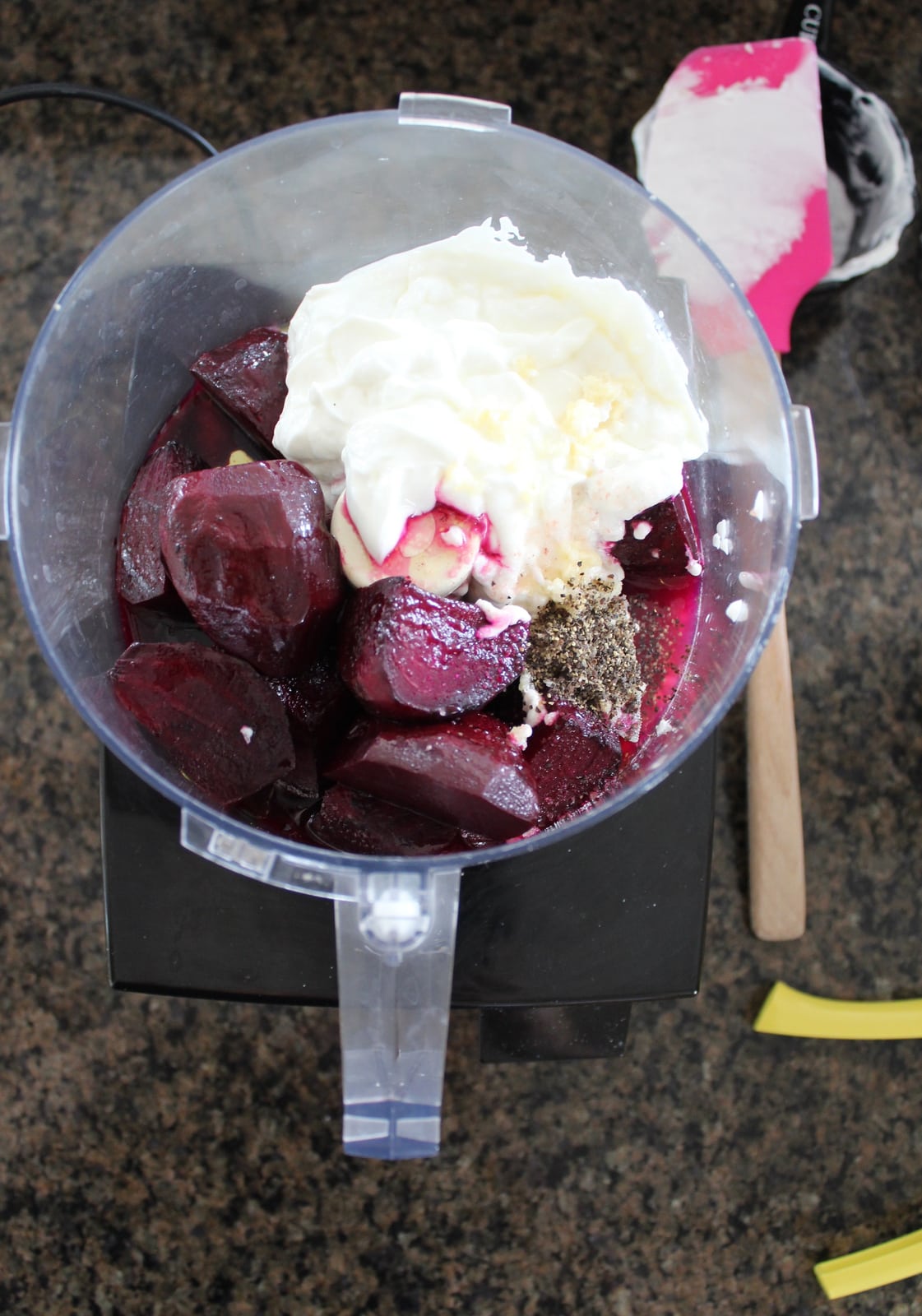 • Place the beets in a food processor with the greek yogurt, vegetable broth, garlic, lemon juice, salt and pepper.