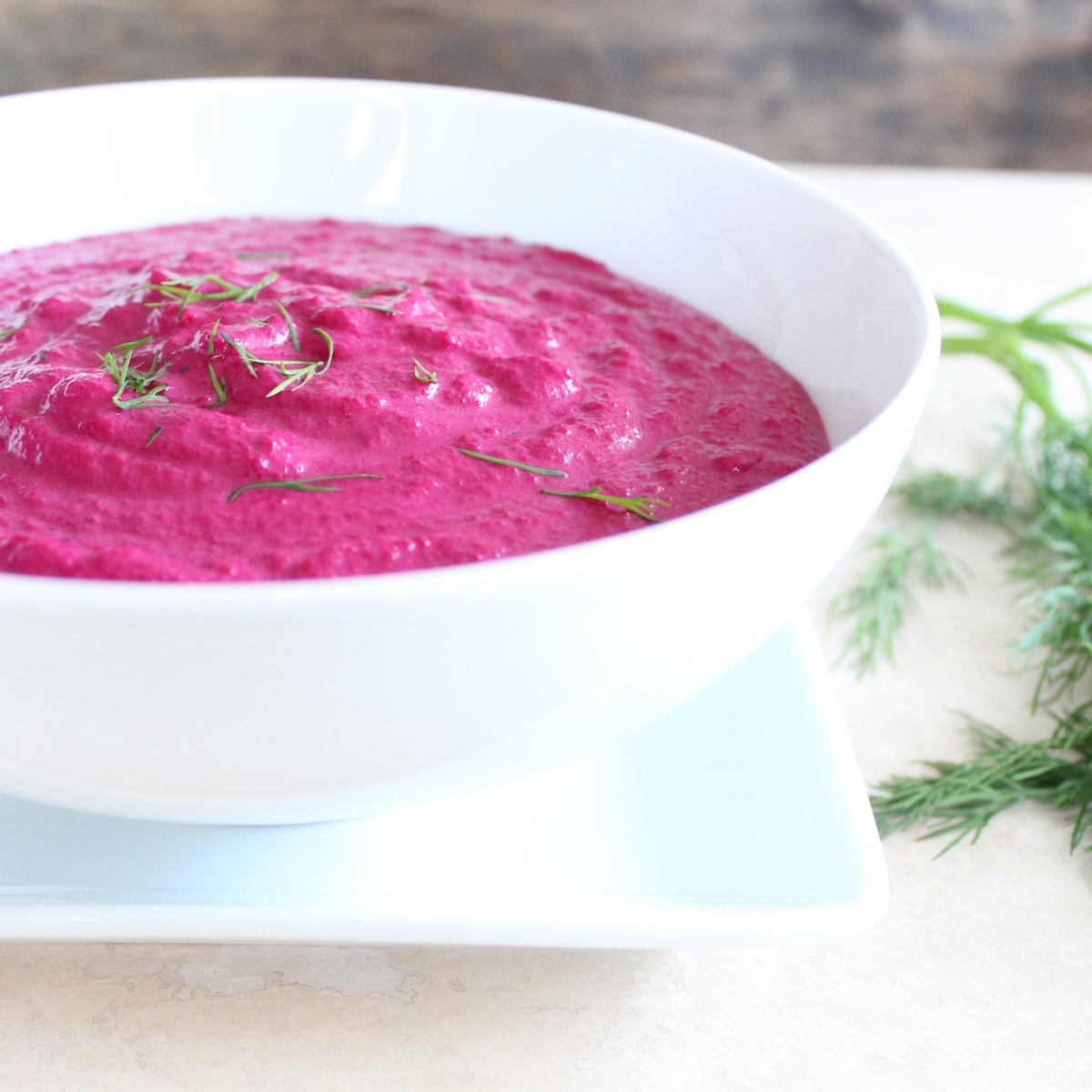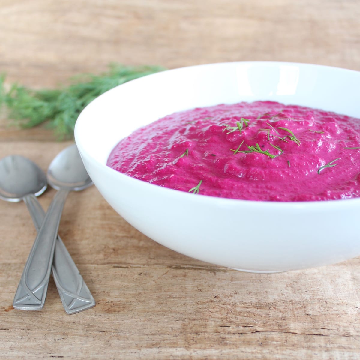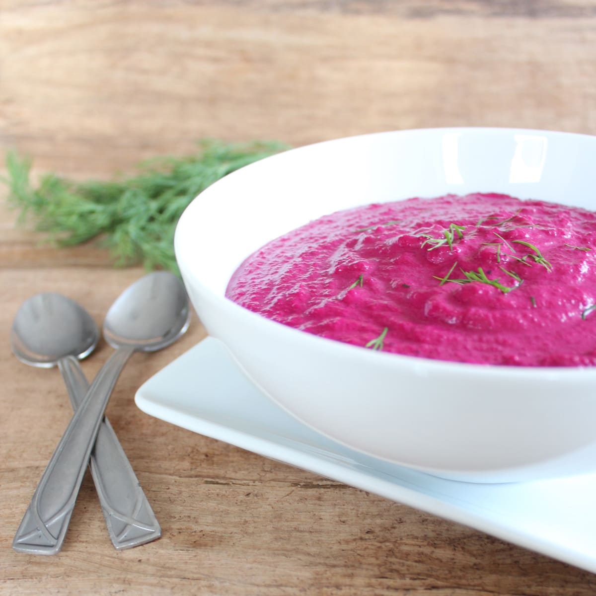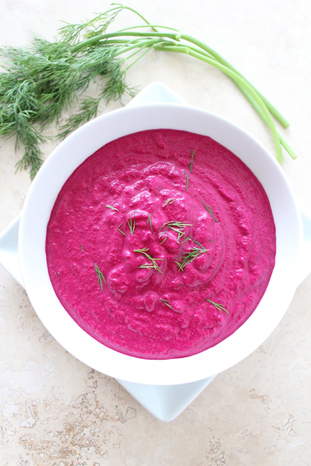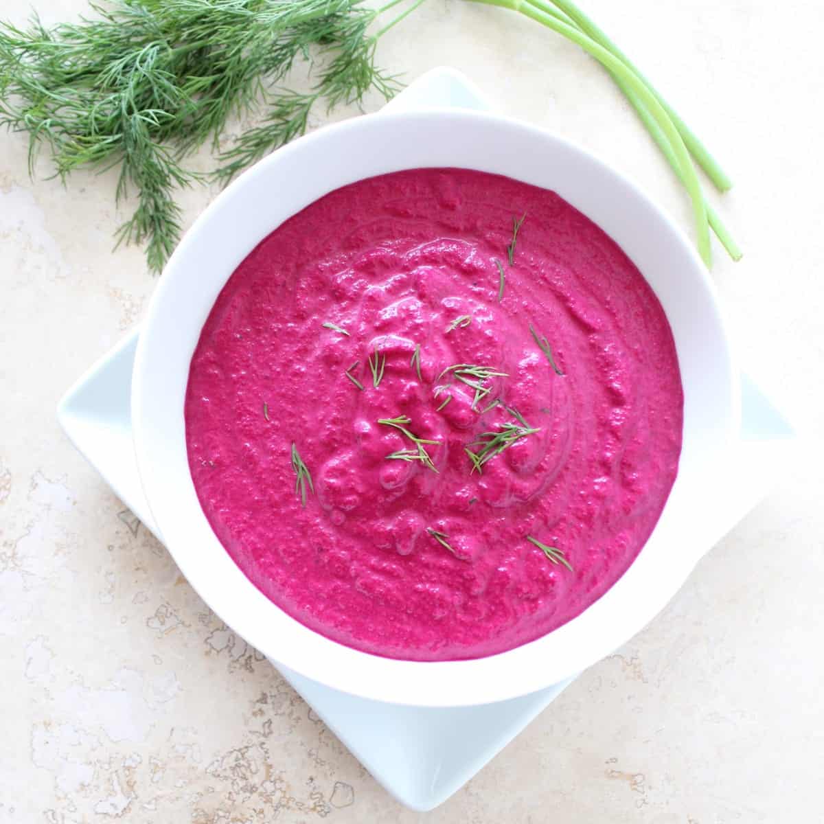 Creamy chilled beet soup is a refreshing vegetarian and gluten free recipe. It's perfect for a spring or summer appetizer!