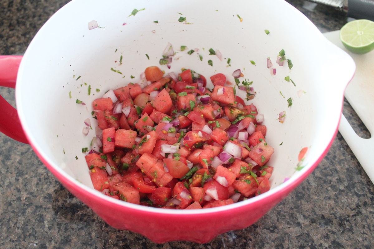 - Add all of the ingredients for the watermelon salsa to a large bowl. Stir to combine.