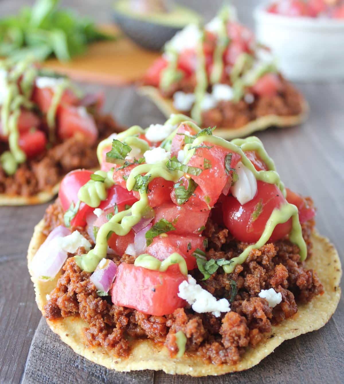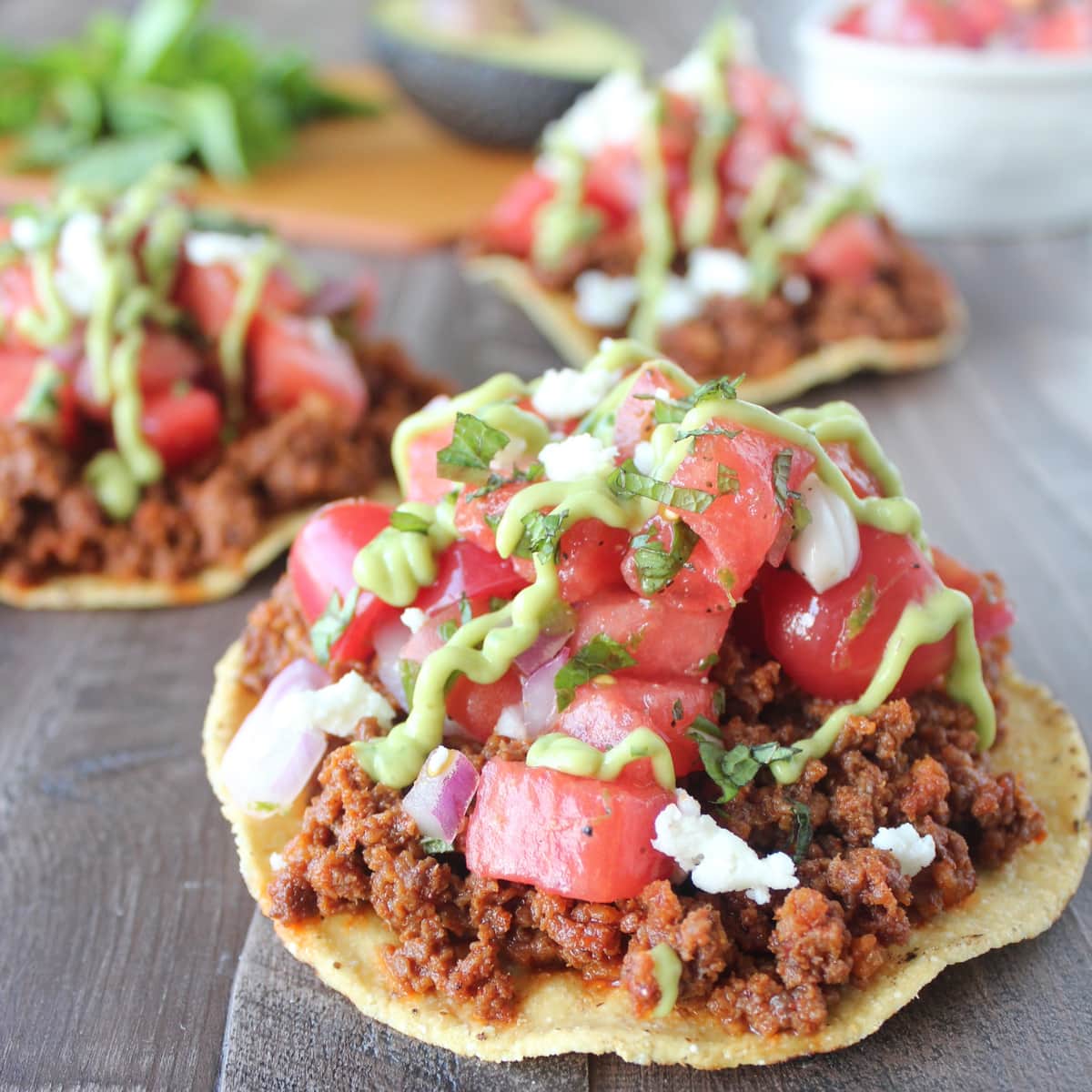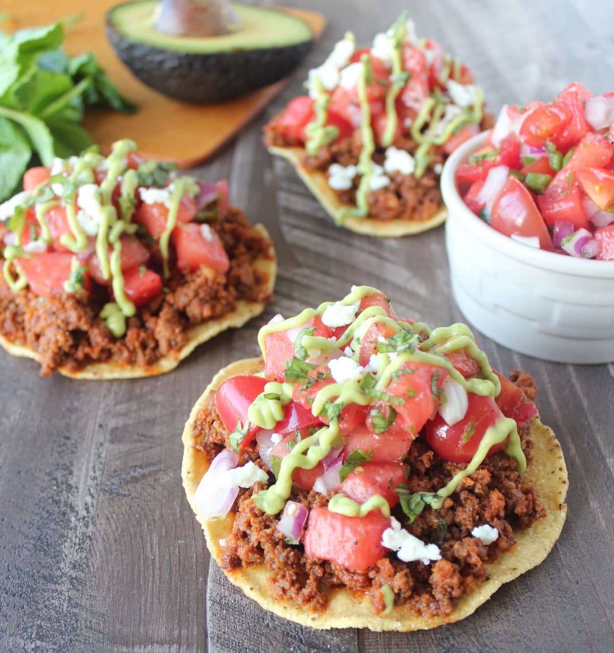 Chorizo Tostadas are topped with fresh, homemade Watermelon Serrano Salsa, Queso Fresco and Creamy Avocado Sauce for a deliciously easy recipe!