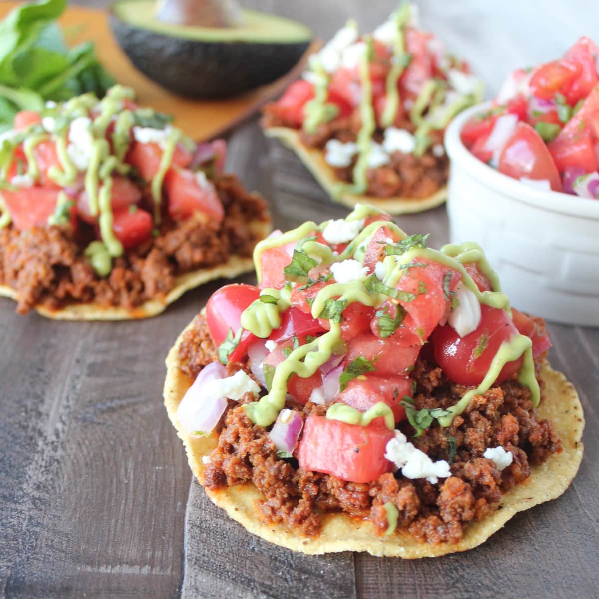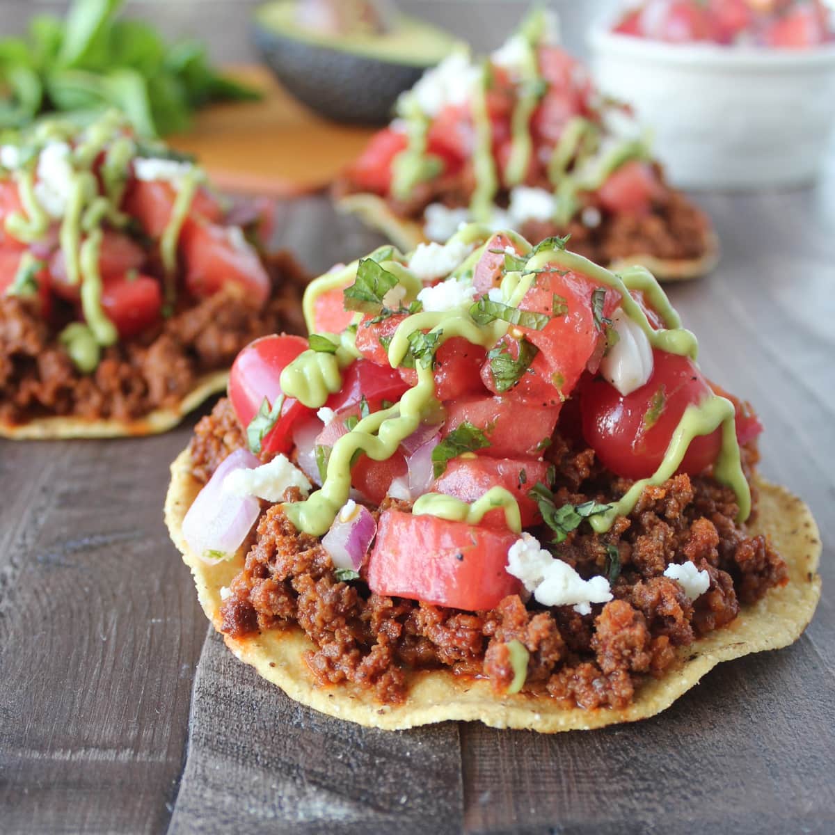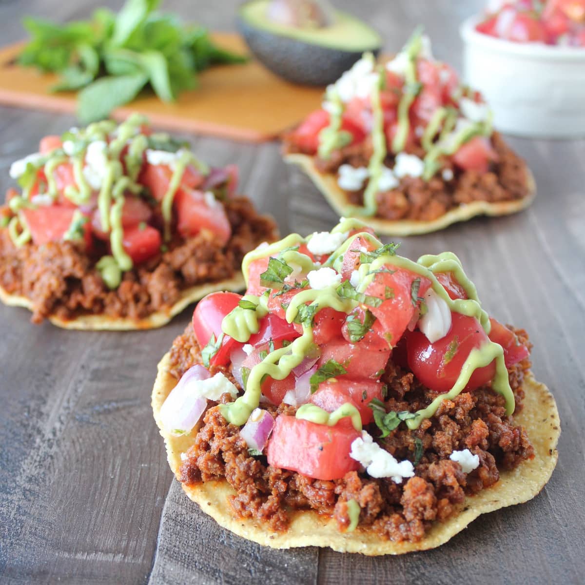 Chorizo Tostadas are topped with fresh, homemade Watermelon Serrano Salsa, Queso Fresco and Creamy Avocado Sauce for a deliciously easy recipe!