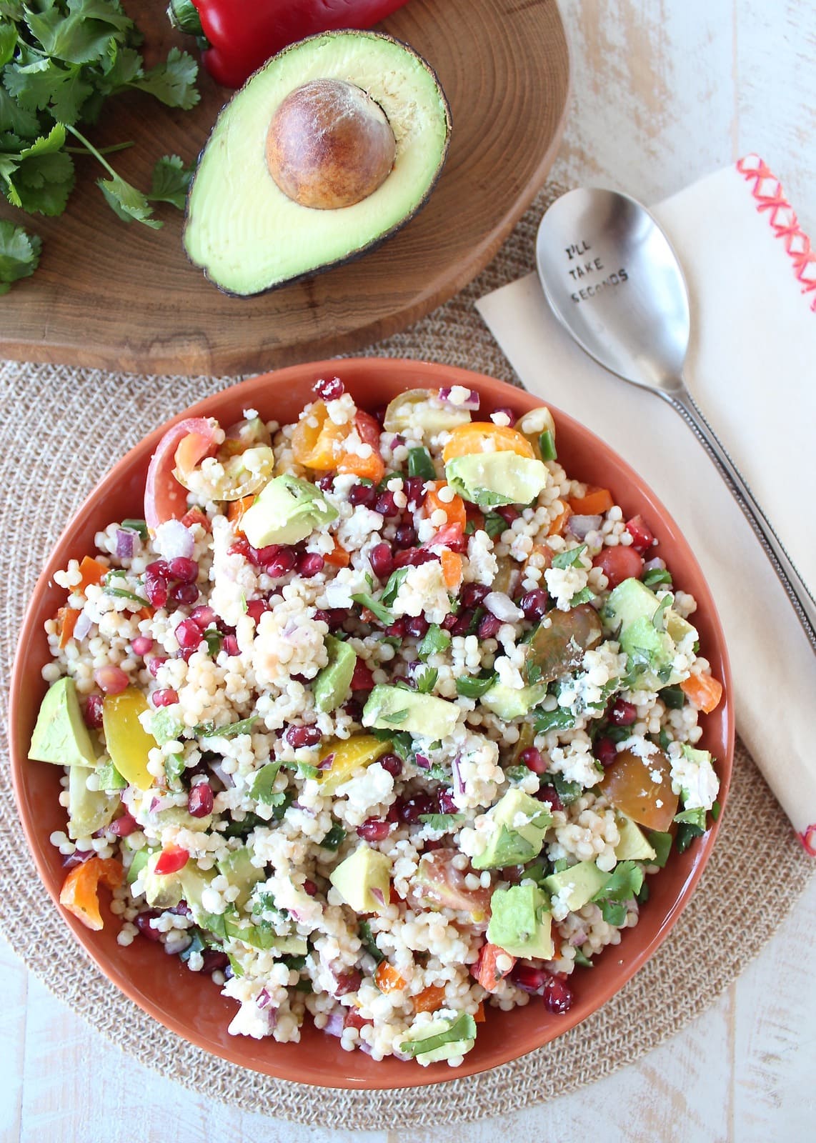 This Israeli couscous salad is delicious, filling and vegetarian! It’s filled with fresh veggies, pomegranate seeds, goat cheese, and creamy avocado cilantro dressing.