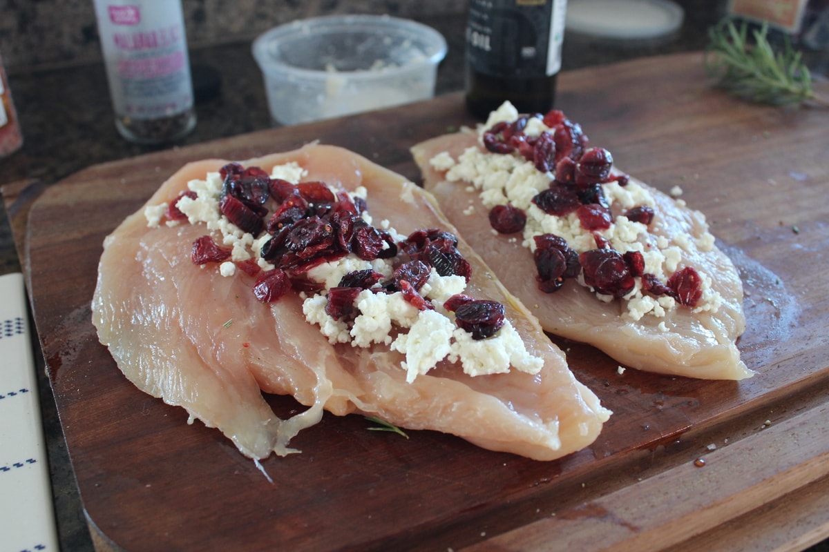 - Fill each chicken breast with goat cheese and cranberries.