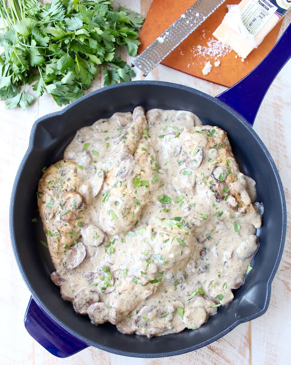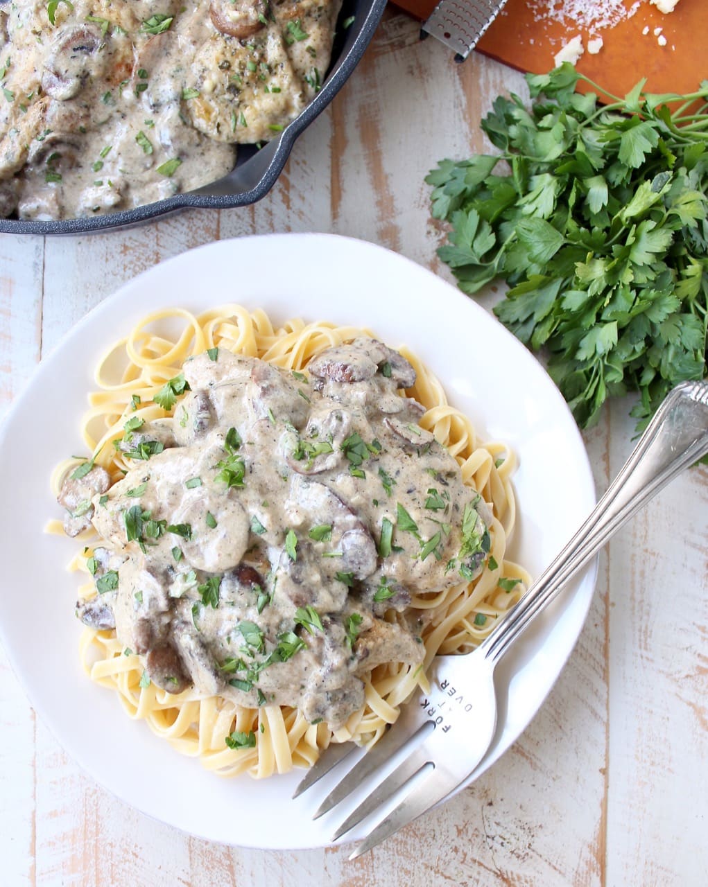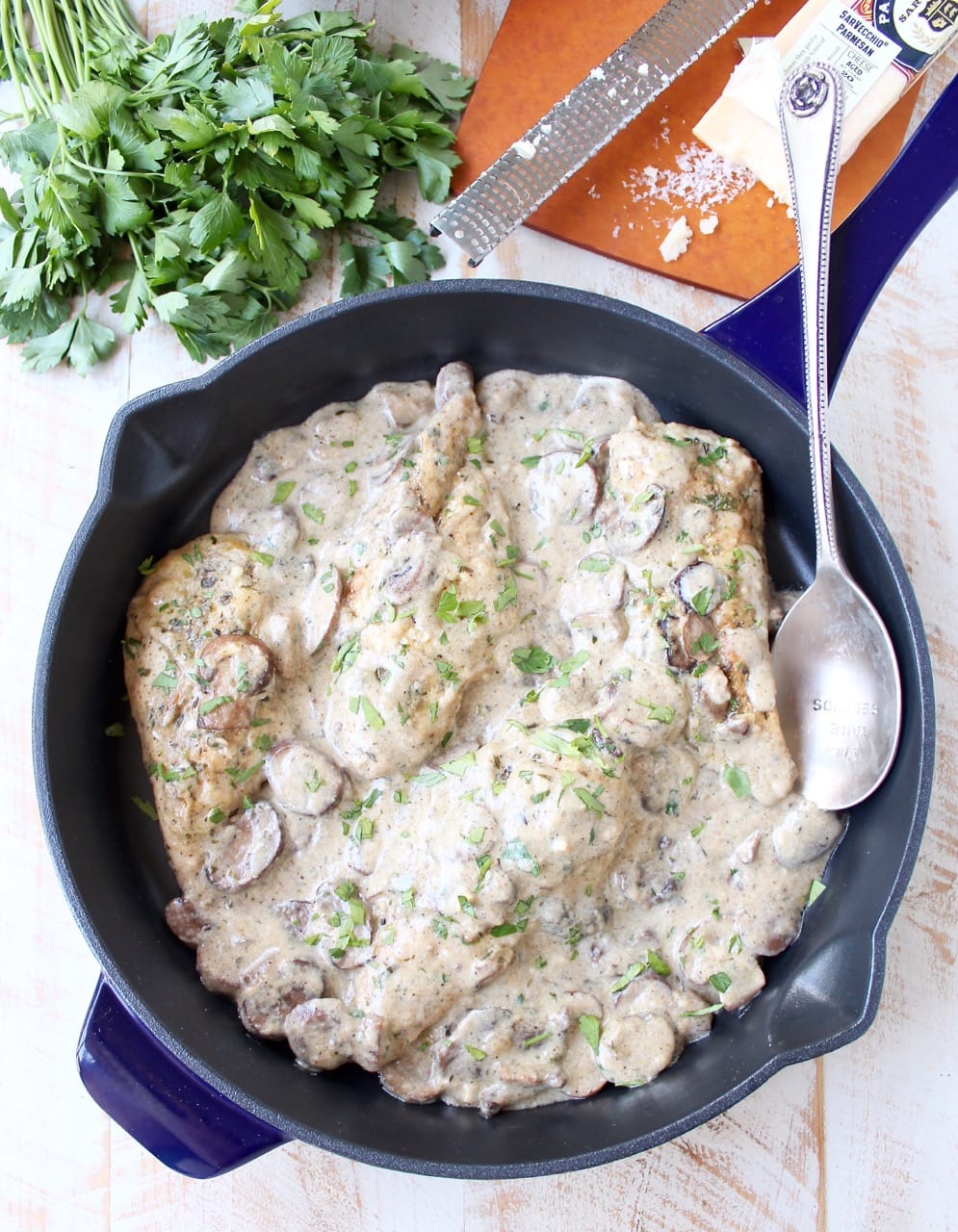 A decadently creamy garlic mushroom sauce covers chicken parmesan in this quick and easy Mushroom Chicken recipe. It’s perfect served with a thick pasta, like fettuccine or pappardelle. This dish is so delicious, you’ll want to make it over and over again!