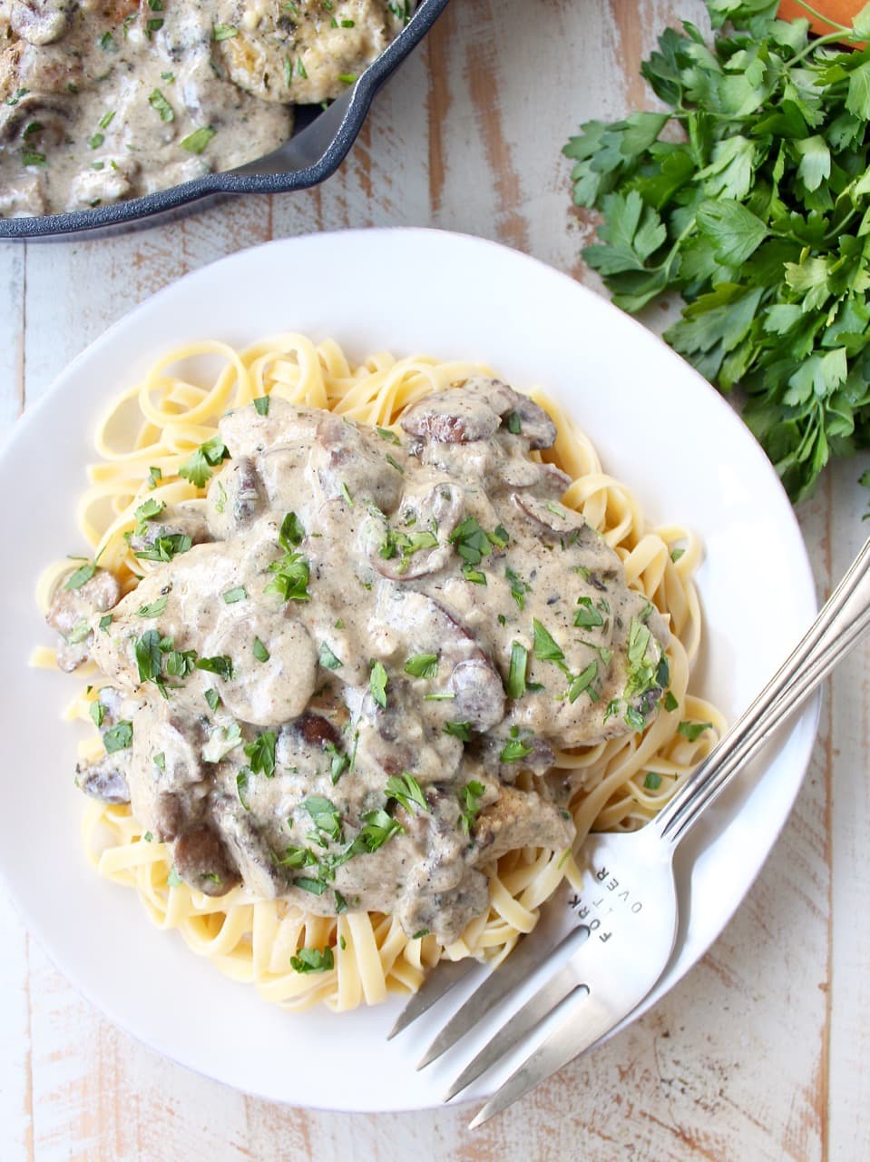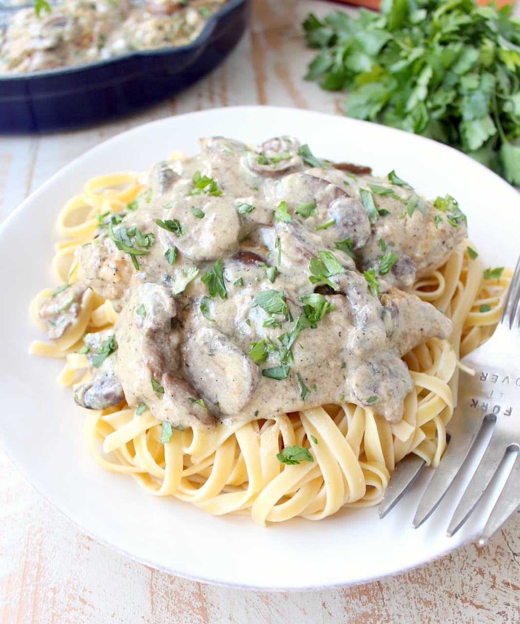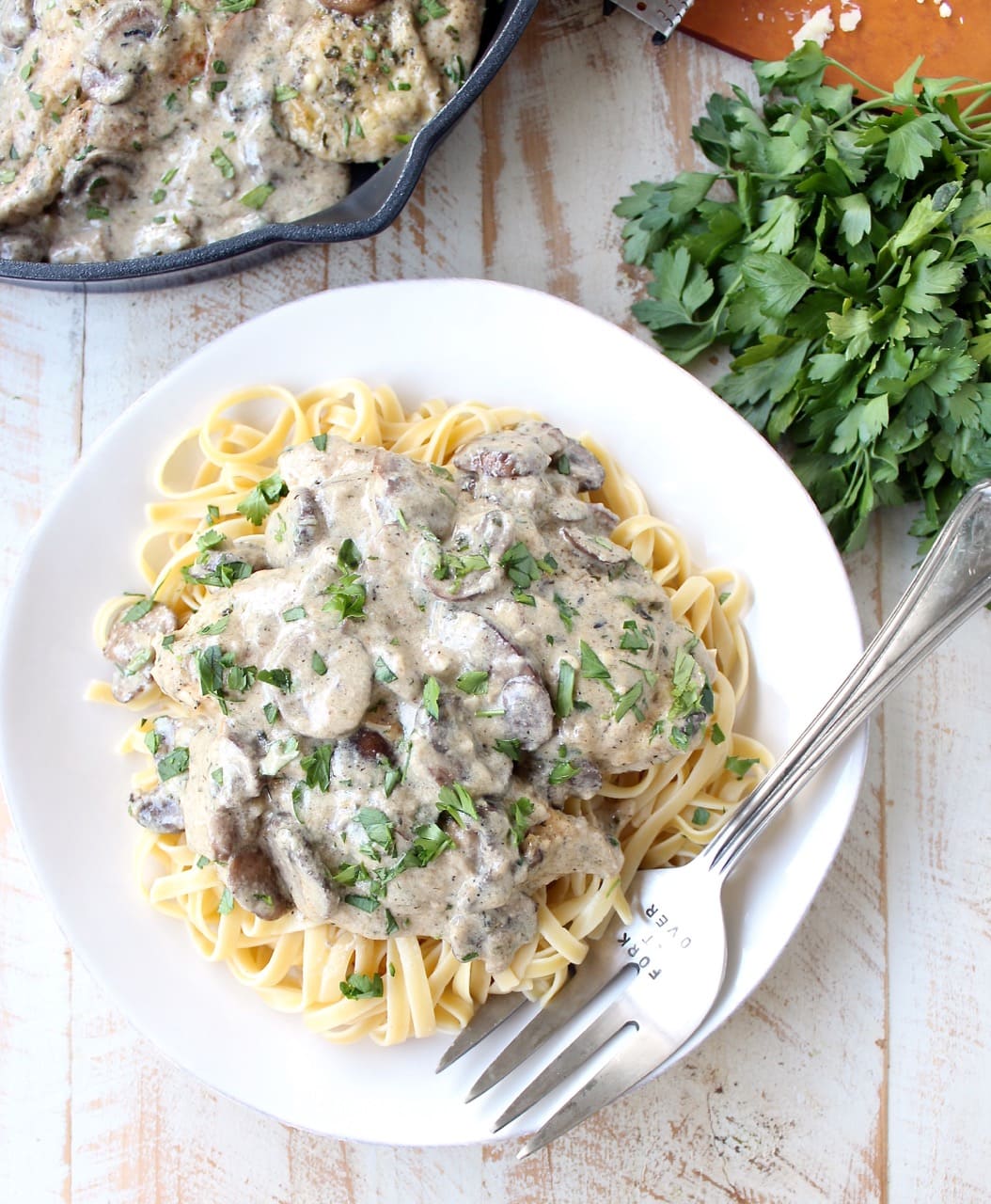 A decadently creamy garlic mushroom sauce covers chicken parmesan in this quick and easy Mushroom Chicken recipe. It’s perfect served with a thick pasta, like fettuccine or pappardelle. This dish is so delicious, you’ll want to make it over and over again!