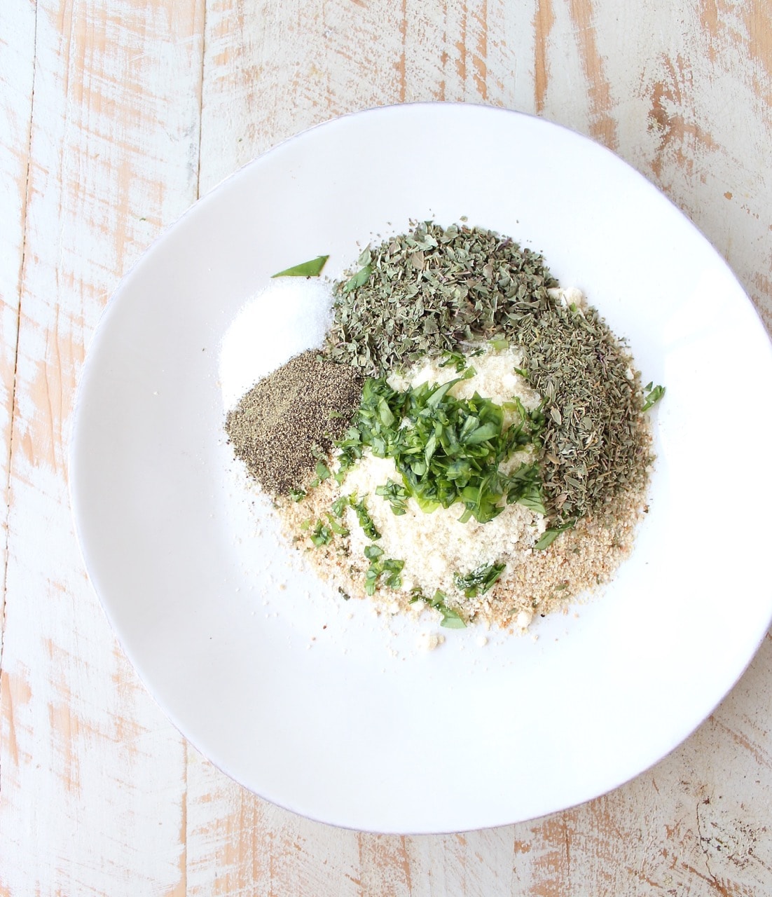 - Combine the remaining 1 tbsp oregano, 1 tbsp thyme, 1 tsp salt and 1 tsp black pepper with the fresh basil, breadcrumbs and 2 tbsp parmesan in a shallow bowl or rimmed plate.
