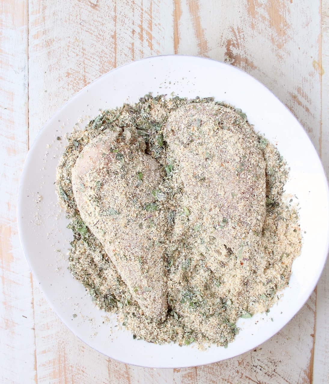 - Drag the chicken breasts through the breadcrumb mixture.