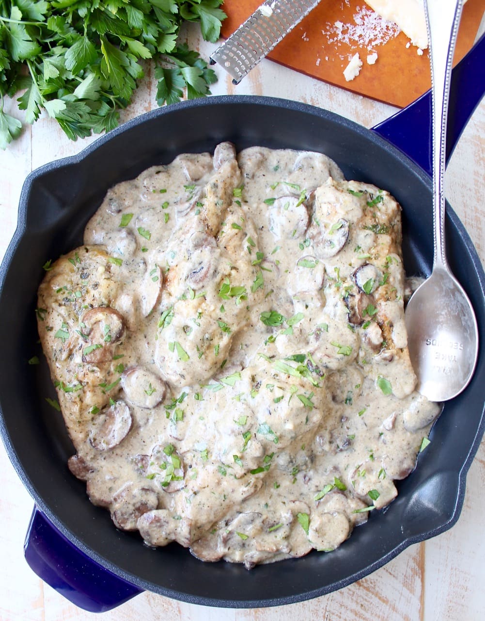 Add the chicken to the skillet and brown on each side for 2-3 minutes. Cover with the creamy mushroom sauce. Sprinkle the remaining 2 tbsp parmesan cheese on top and place in the oven for 15-20 minutes.