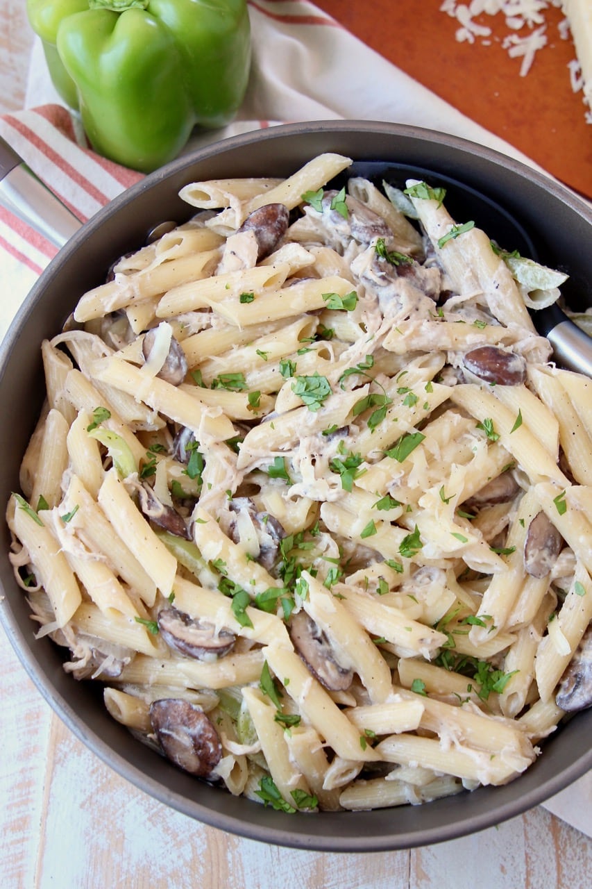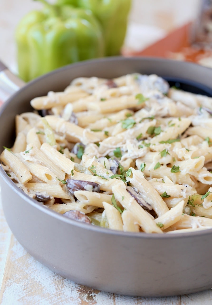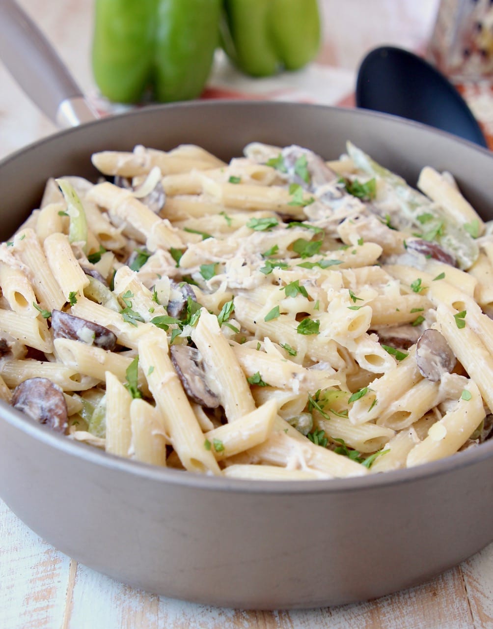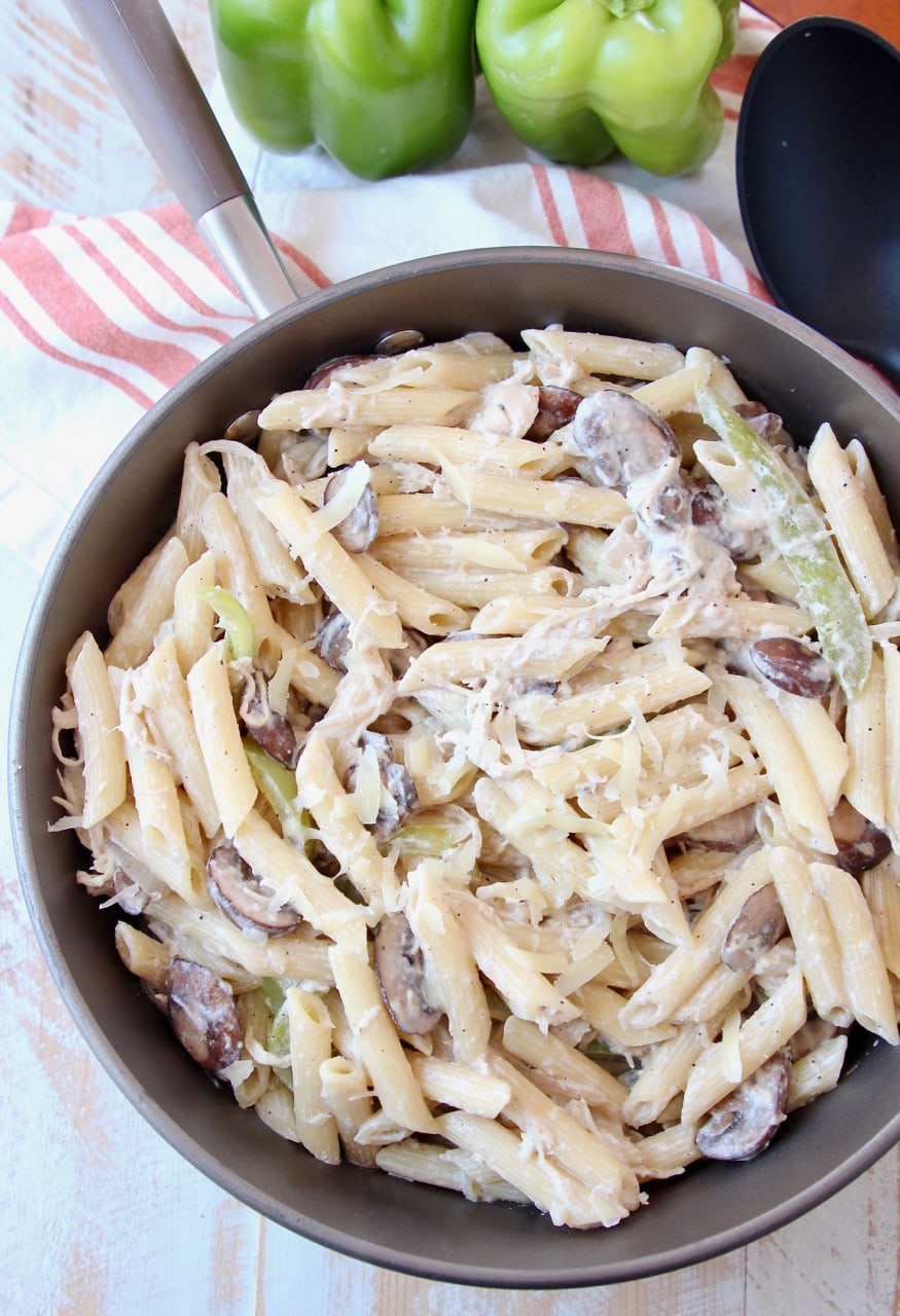 French Onion Chicken Penne Pasta in Skillet with Green Bell Peppers