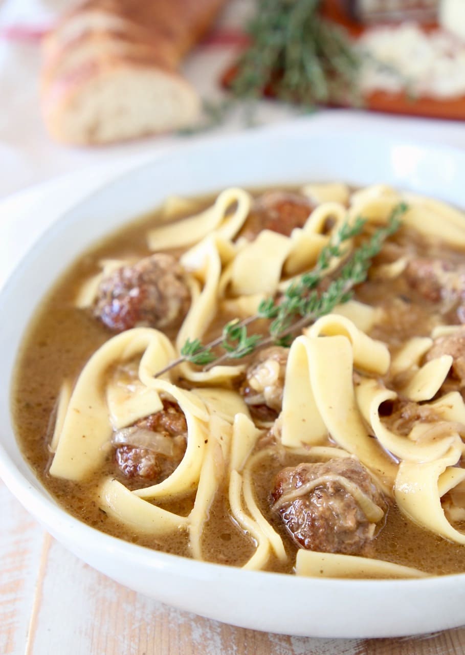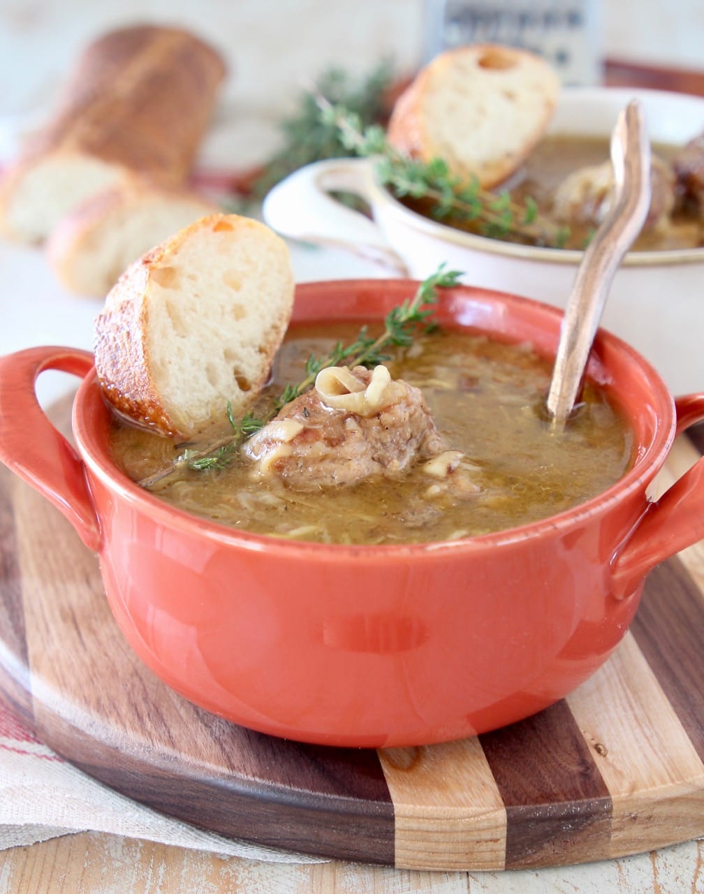Today I have a delicious new recipe mash-up to share, combining meatballs and french onion soup. Together, they make the best meatball soup ever!