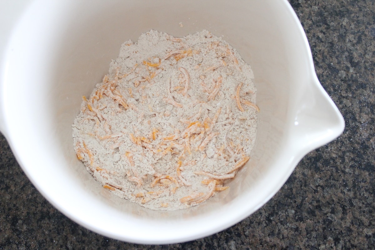 - Combine the flour, baking powder, baking soda, sugar, salt, garlic powder and cheddar cheese together in a large bowl.