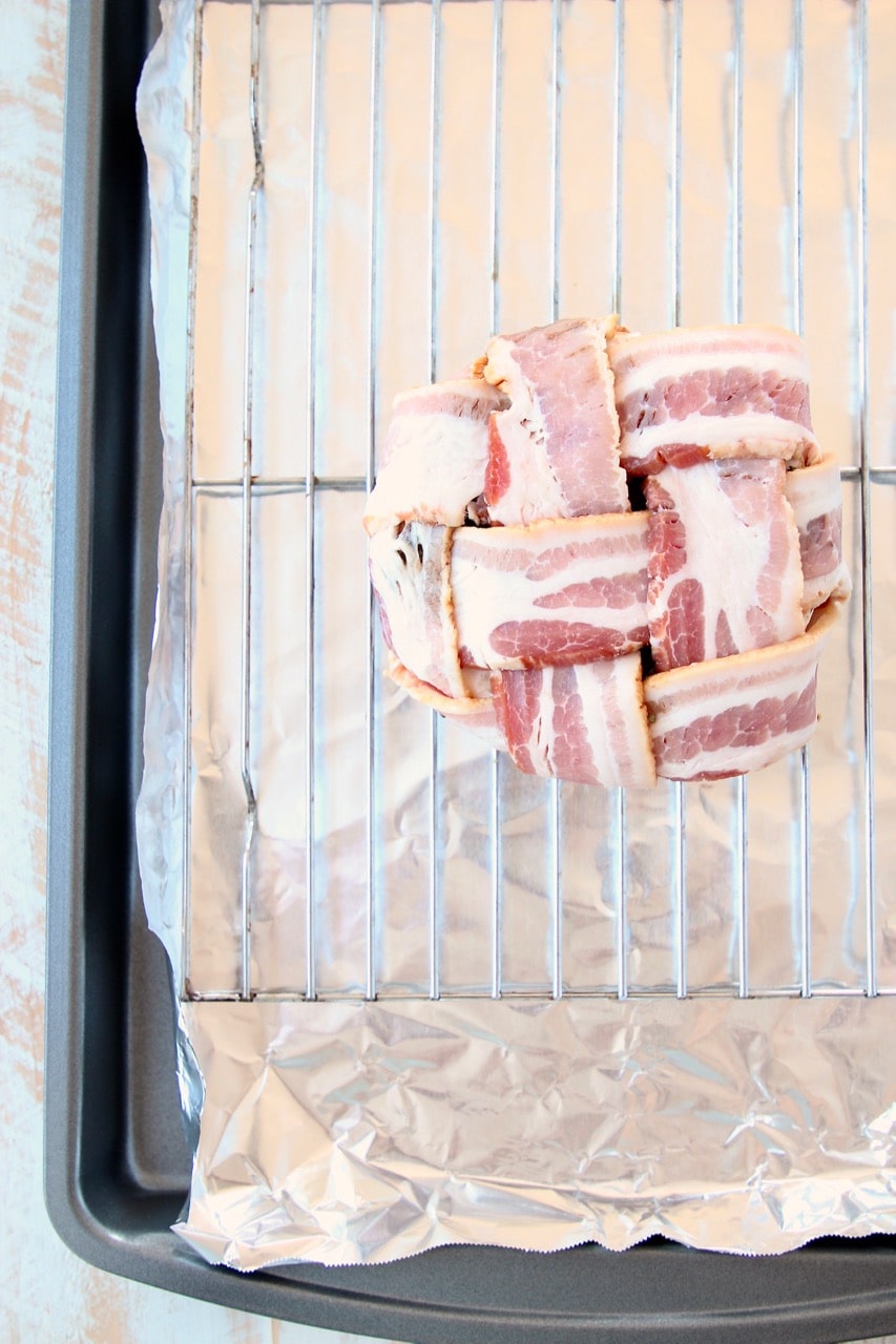 - Cut 4 slices of bacon in half and weave the 8 pieces of bacon together. Place the bacon weave on top of the brie and tuck underneath.