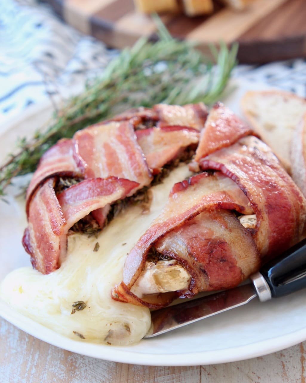 Bacon wrapped brie is an easy, savory recipe that combines delicious crispy bacon with warm melty brie, creating the perfect party appetizer!