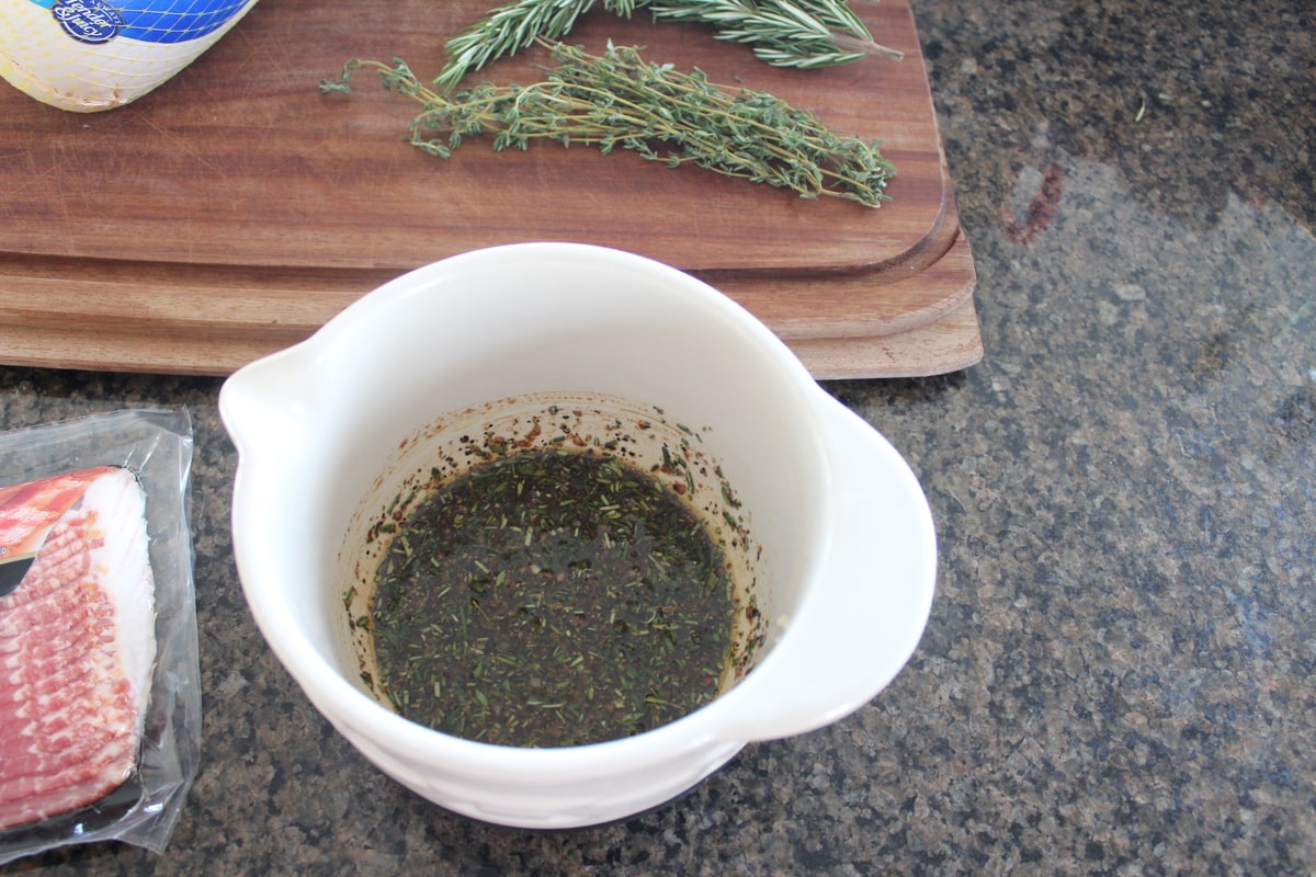 Wrap the bacon around the turkey, and tuck it underneath. Make sure the ends of the rosemary and thyme sprigs slightly stick out at the end for easy removal after the turkey has roasted.