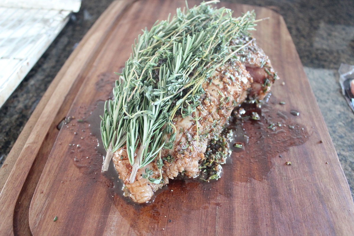 - Place the two remaining sprigs of rosemary and thyme on top of the turkey.