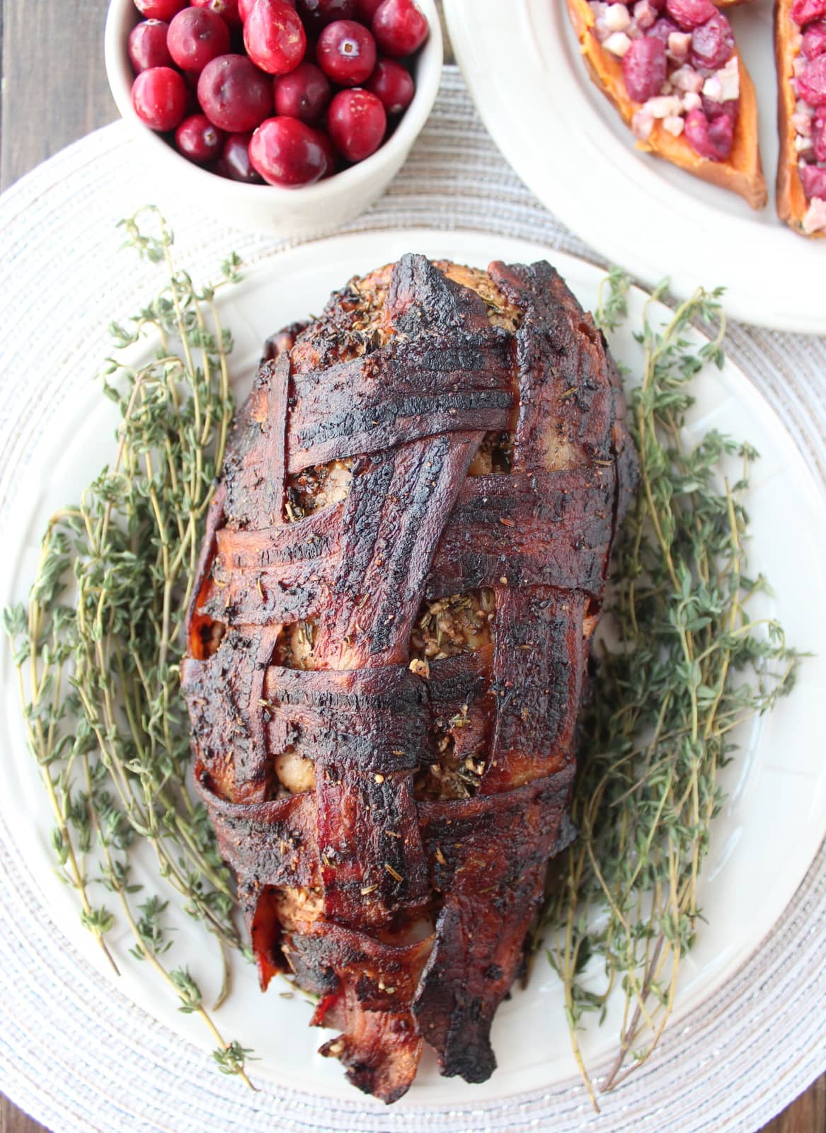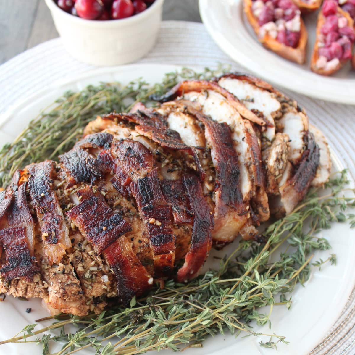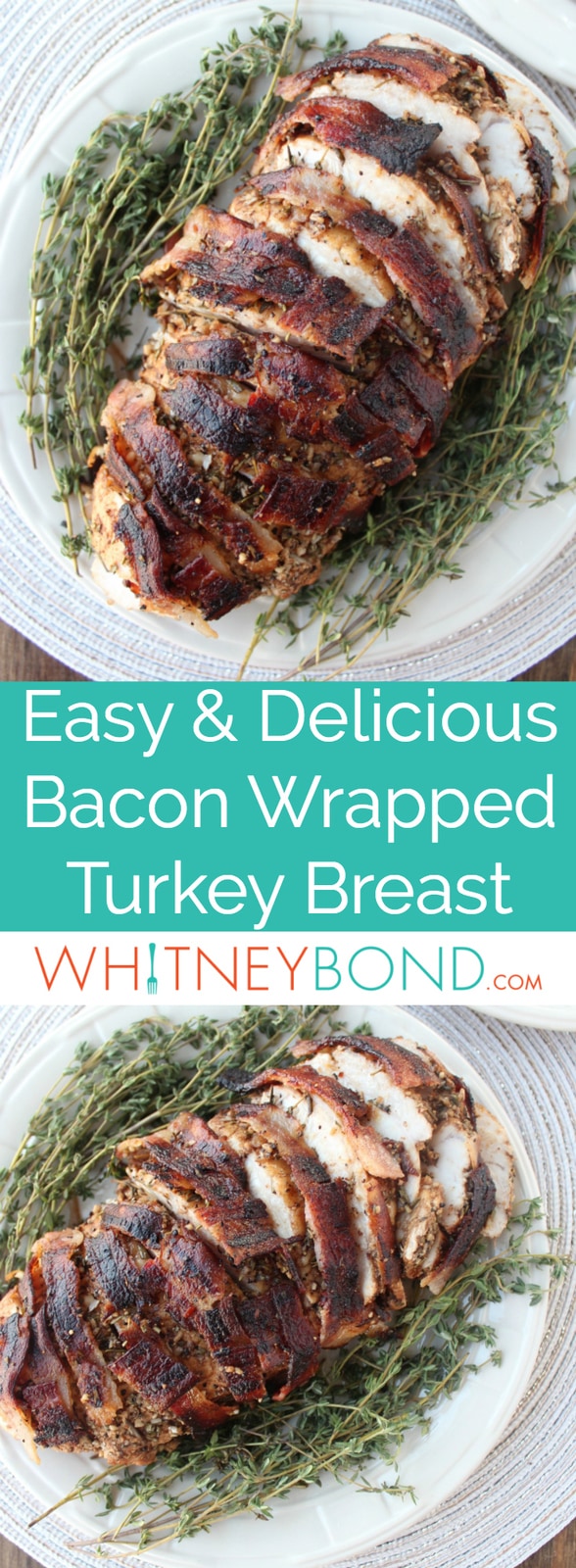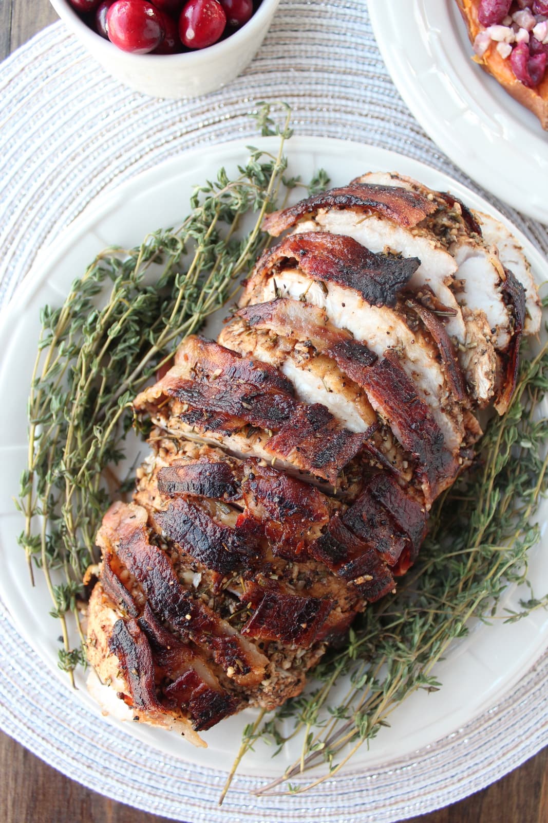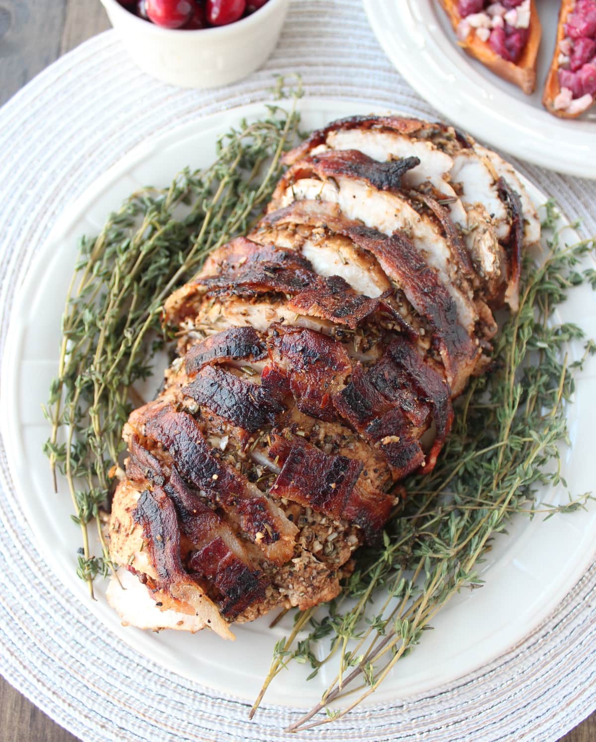 This year I decided we should throw in something new so I mimicked one of my most popular recipes, this Bacon Wrapped Pork Loin. This new turkey breast recipe is coated in a delicious balsamic herb rub, then wrapped up in crispy bacon goodness!