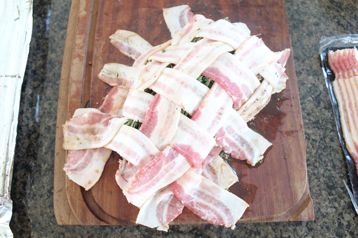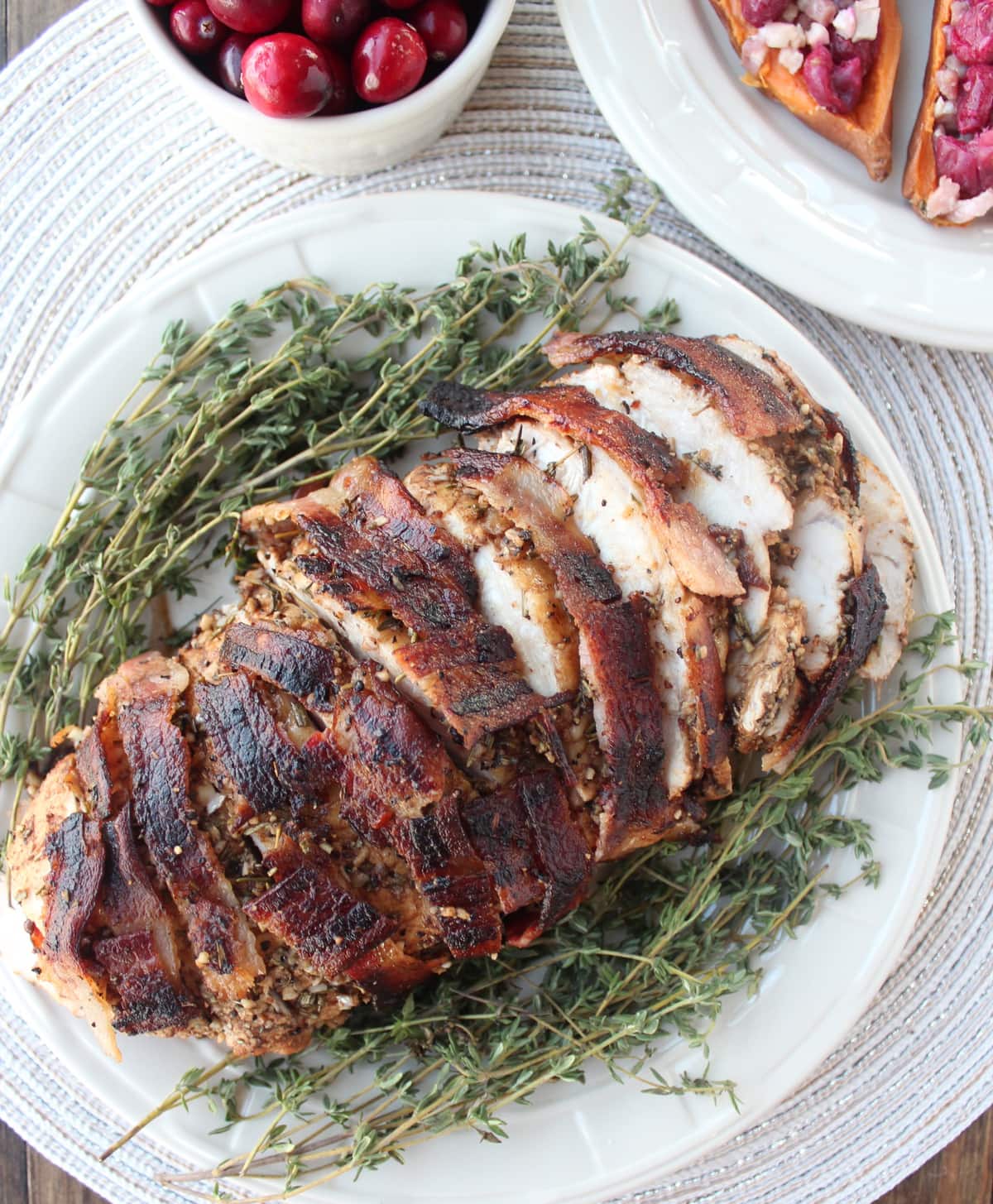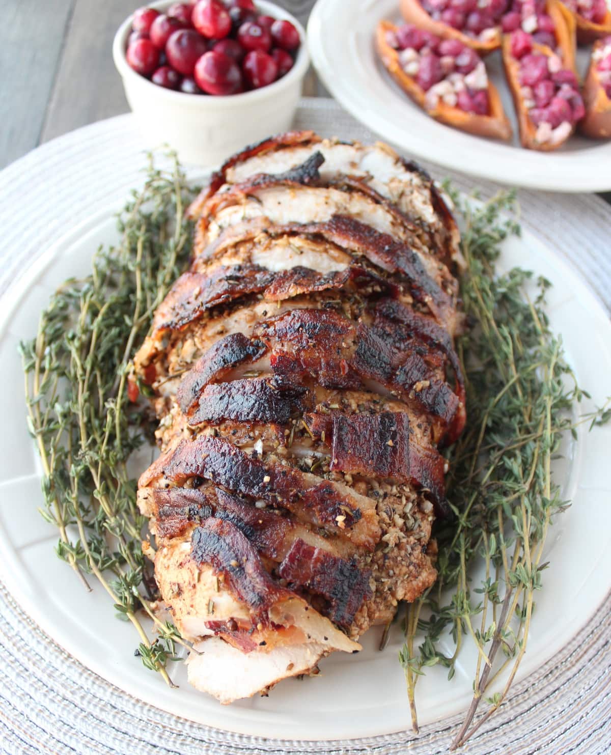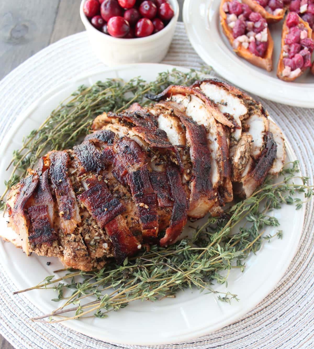 This year I decided we should throw in something new so I mimicked one of my most popular recipes, this Bacon Wrapped Pork Loin. This new turkey breast recipe is coated in a delicious balsamic herb rub, then wrapped up in crispy bacon goodness!