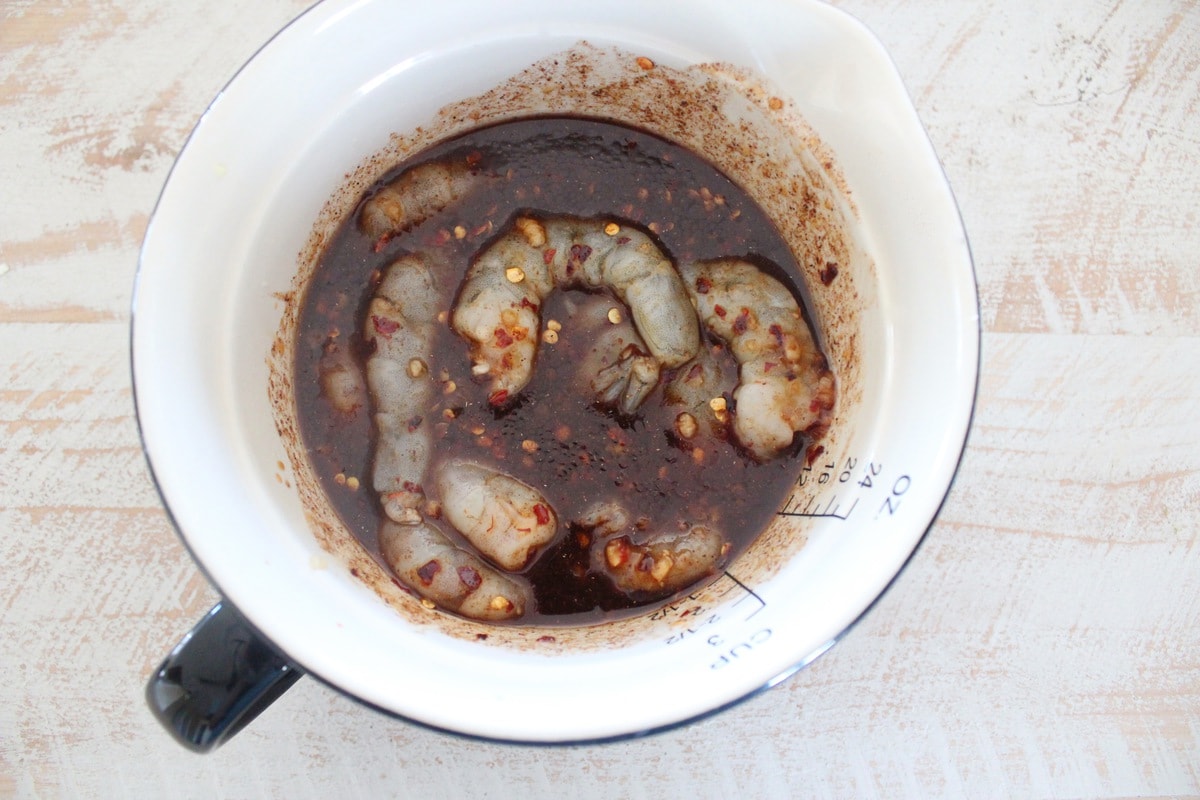 Crush and add 3 cloves of garlic and 2 tsp of grated ginger. Whisk to combine. Add the shrimp to the sauce, then place in the refrigerator.
