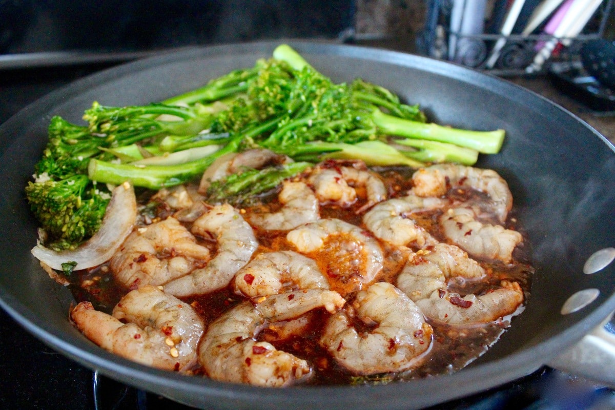 Move the vegetables to one side of the pan, then add the shrimp and sauce to the other side of the pan and cook for 3-4 minutes, flipping the shrimp after about 2 minutes.