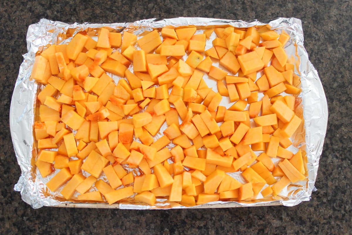 • Place the butternut squash on a foil-lined baking sheet and drizzle the olive oil over the squash. Sprinkle 1 tsp salt and 1 tsp pepper on top.