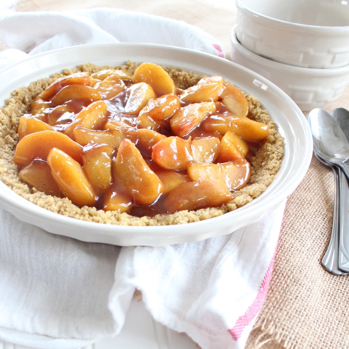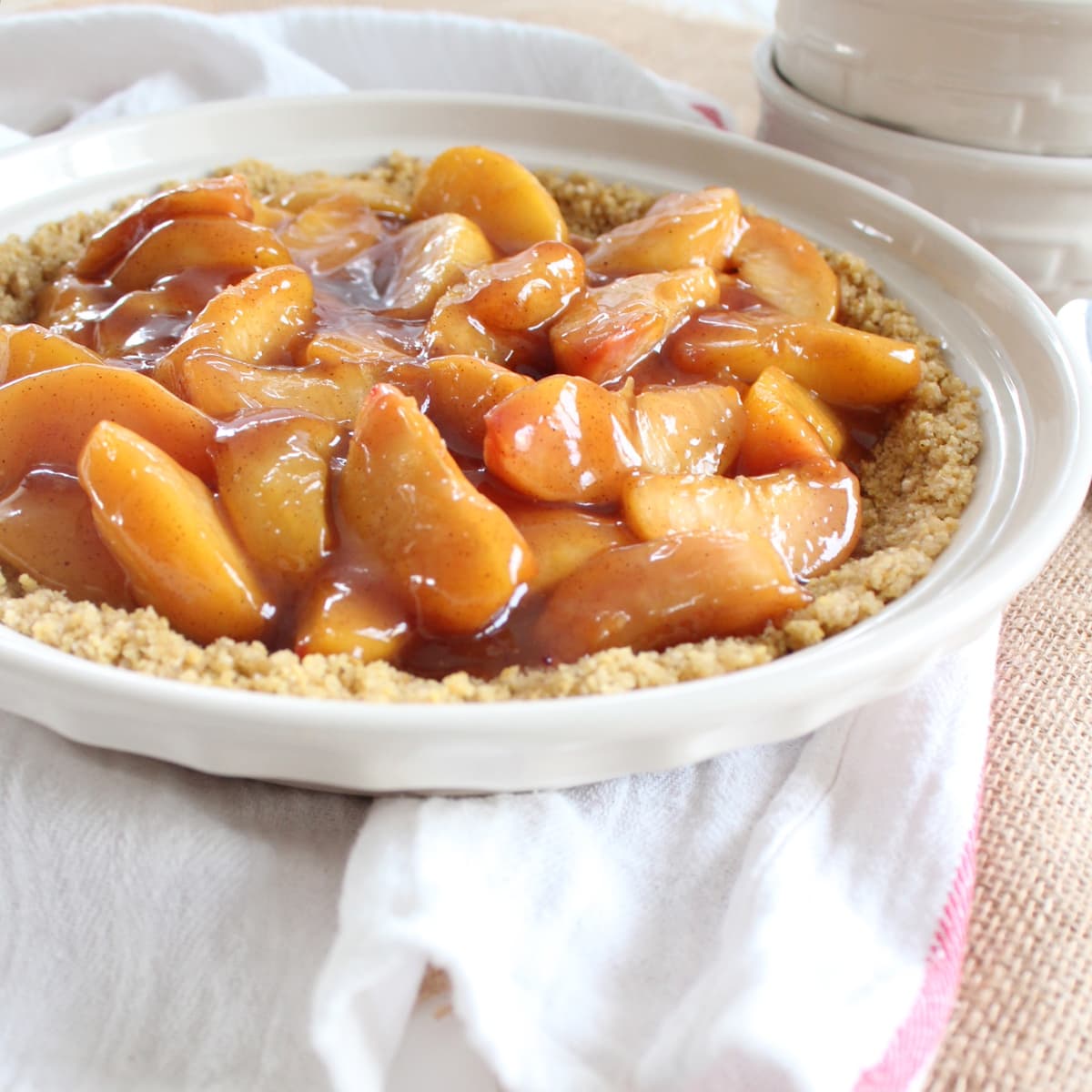 - Pour the peaches into the pie crust and place back in the refrigerator for 30 minutes to chill.