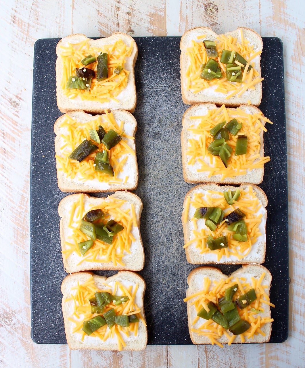 - Place the sliced jalapeños on top of the cheddar cheese.