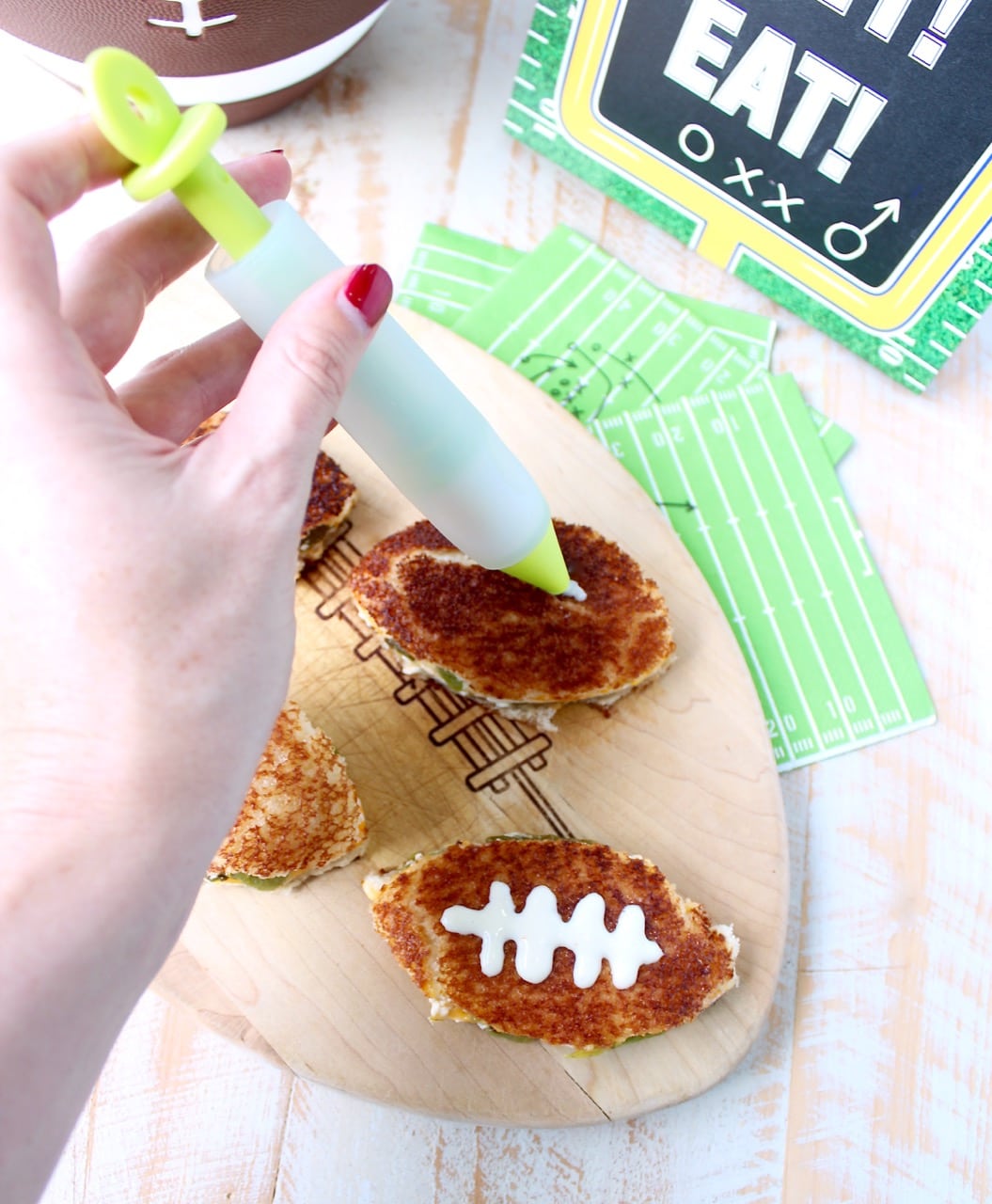 Fill a squeeze bottle (or the sweet pastry writing pin you see below!) with blue cheese or ranch dressing to draw your “football laces” on the sandwich.