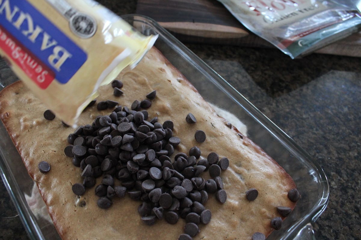 • Remove from the oven and top with the additional chocolate chips.