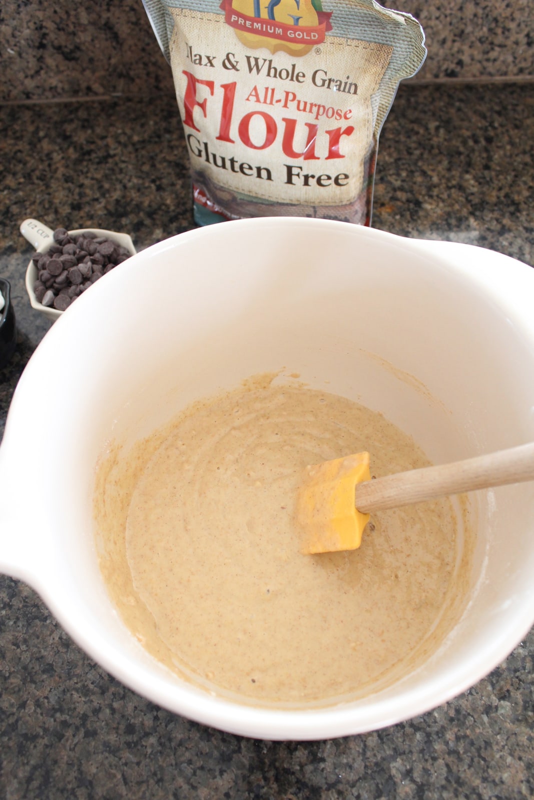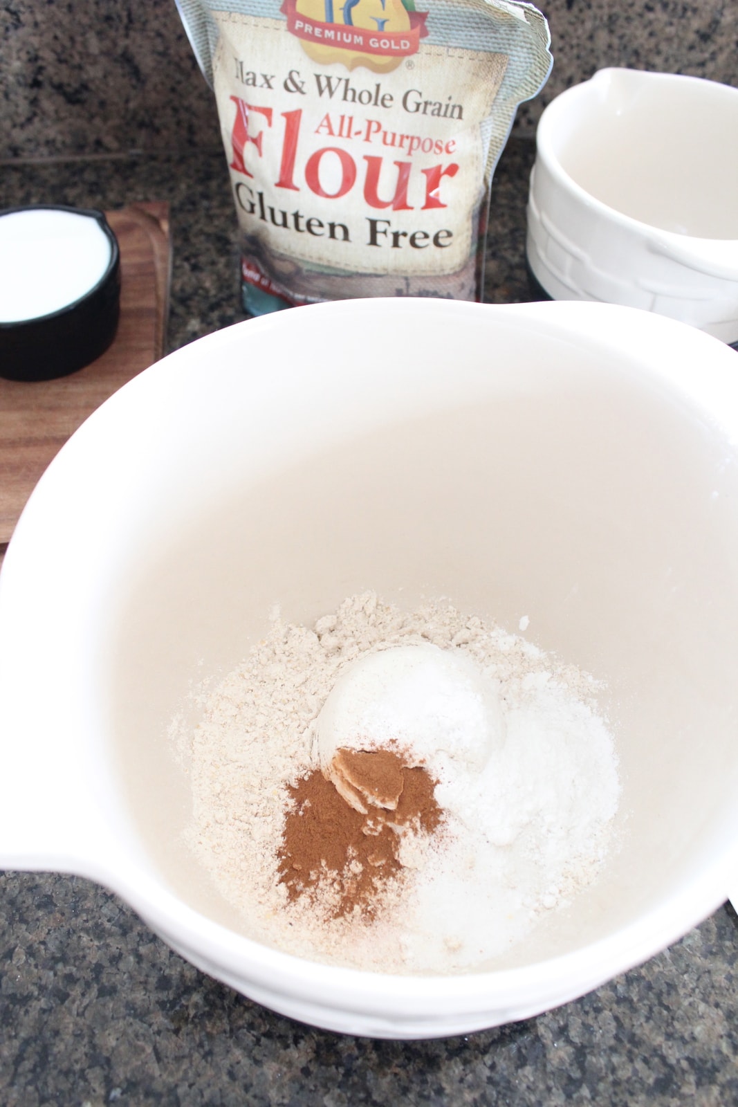 - Combine the gluten free flour, sugar, baking powder, salt and cinnamon in a large mixing bowl.